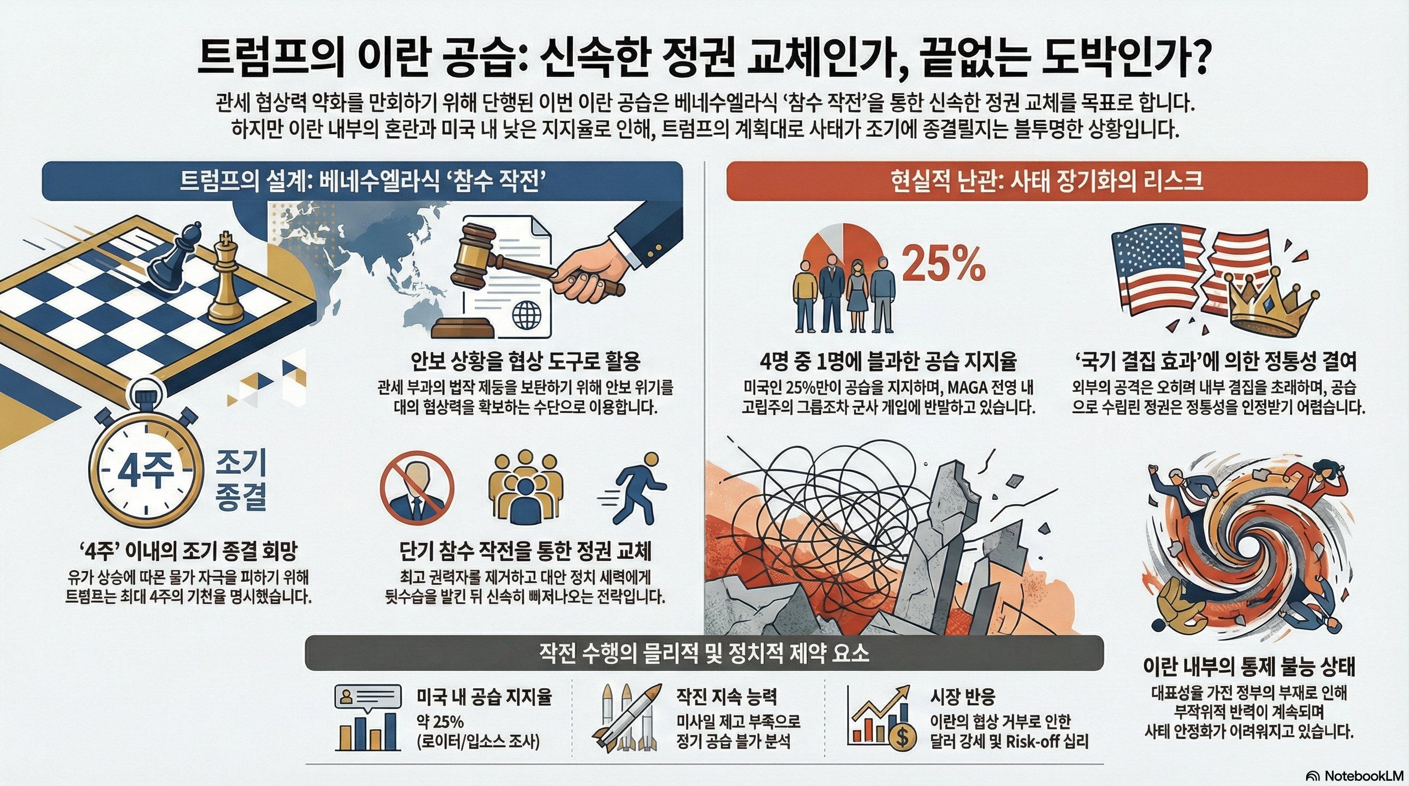 공습 이전에 사전 녹화된 영상에서 트럼프는 공개적으로 발언했죠. 이란 국민들에게 나라를 되찾을 기회라고. 이 발언의 오만함과 무지함은 차치하고, 그의 의도를 간접적으로 추론해 볼 수 있죠. 트럼프는 참수작전으로 빠른 정권 교체를 희망한 것으로 보이고, 신정체제와 민주주의가 결합된 이란의 독특하고 복잡한 권력구도 상 제거해야 할 대상이 상당히 많았기에 베네수엘라에서처럼 최고 지도자만을 제거해서는 안되는 상황이 아니었나 생각됩니다.