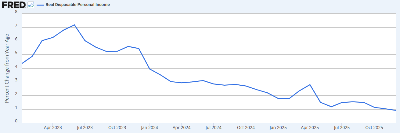 그래서 지난 아티클에서 흔들리는 고용, 높아지는 연체율을 다루었던 거죠. 위 차트는 뉴욕 연은에서 분기 단위로 조사하는 가계 연체율 추이입니다. 대략 23년 하반기부터 연체율이 급격히 높아지기 시작하죠. 방금 살펴본 가처분 소득 감소세도 23년 하반기부터 시작됐습니다.