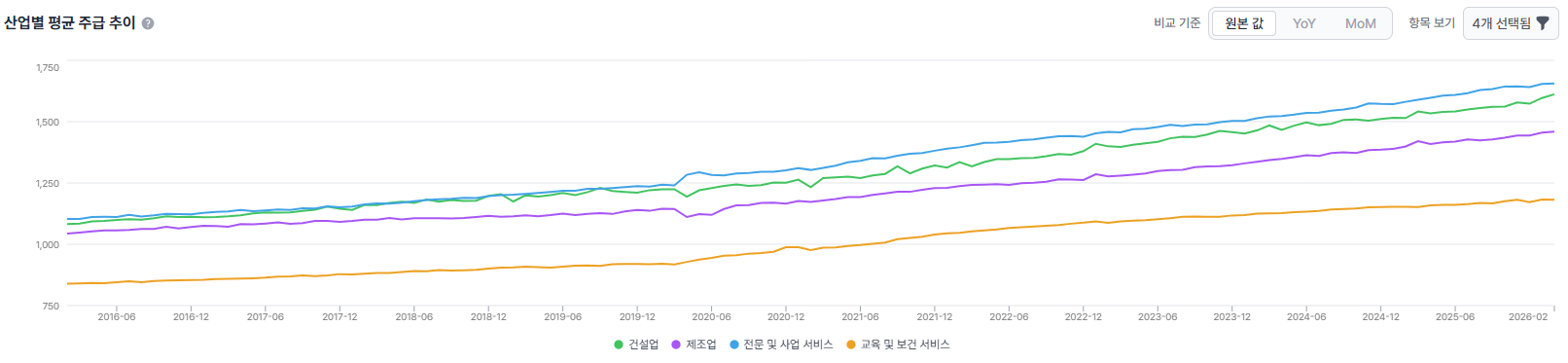문제는? 초록 형광펜 구간을 보면 2022년 이후로 보건 의료 신규 일자리의 비중이 급격하게 증가했다는 점입니다. 그리고 같은 기간 주황선 프로페셔널 서비스, 초록선 제조업 신규 일자리의 비중은 급격하게 감소했죠. 2022년 이후로 65세 이상 고령 인구가 급격히 늘어났을 리도 없는데 이런 현상이 나타났다는 것은 고임금 양질의 일자리는 줄어들고 저임금 서비스 일자리만 늘어났다는 것을 의미합니다.