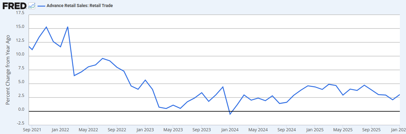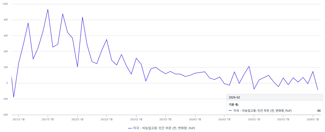 위 차트는 비농업 신규고용 (Non-Farm Payroll) 의 전월 대비 변화량입니다. 우리가 매월 보는 NFP 수치가 이거에요. 차트를 보면 한 눈에 뭐가 보이죠? 2021년 이후로 빠르게 하락하는 추세가 보입니다. 25년 내내 그래도 0을 상회하면서 신규 일자리는 늘어난다고, 고용 좋다고 말하는 이들마저 있었지만 전반적인 추세는 하락세입니다. 그러다가 이번 2월에 크게 한 번 휘청거린 거죠.