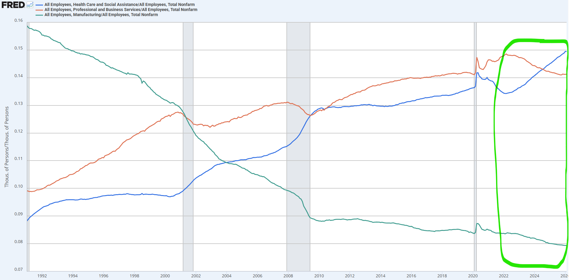 이 차트는 전체 NFP에서 각 산업섹터의 비중을 그린 겁니다. 파란선이 보건의료 분야 신규 일자리의 비중이에요. 보시다시피 꾸준히 높아집니다. 미국도 65세 이상 인구 비중이 꾸준히 늘어나는 고령화 사회이기에 보건의료 분야 비중이 높아지는 것 자체는 당연한 현상이에요.
