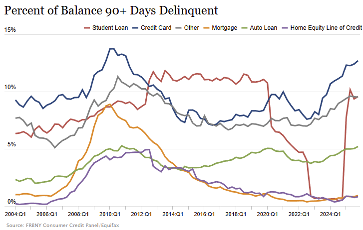 미국 가계 실질 가처분 소득의 YoY 추이입니다. 23년 하반기부터 꾸준히 감소세를 보이고 있습니다. 고용 데이터와 합이 잘 맞죠? 가계의 가처분 소득이 줄어들면 가계는 지출을 유지하기 위해 신용 (대출) 에 의지하게 되고, 이 기간이 길어지면 이자 납부 연체로 이어집니다.