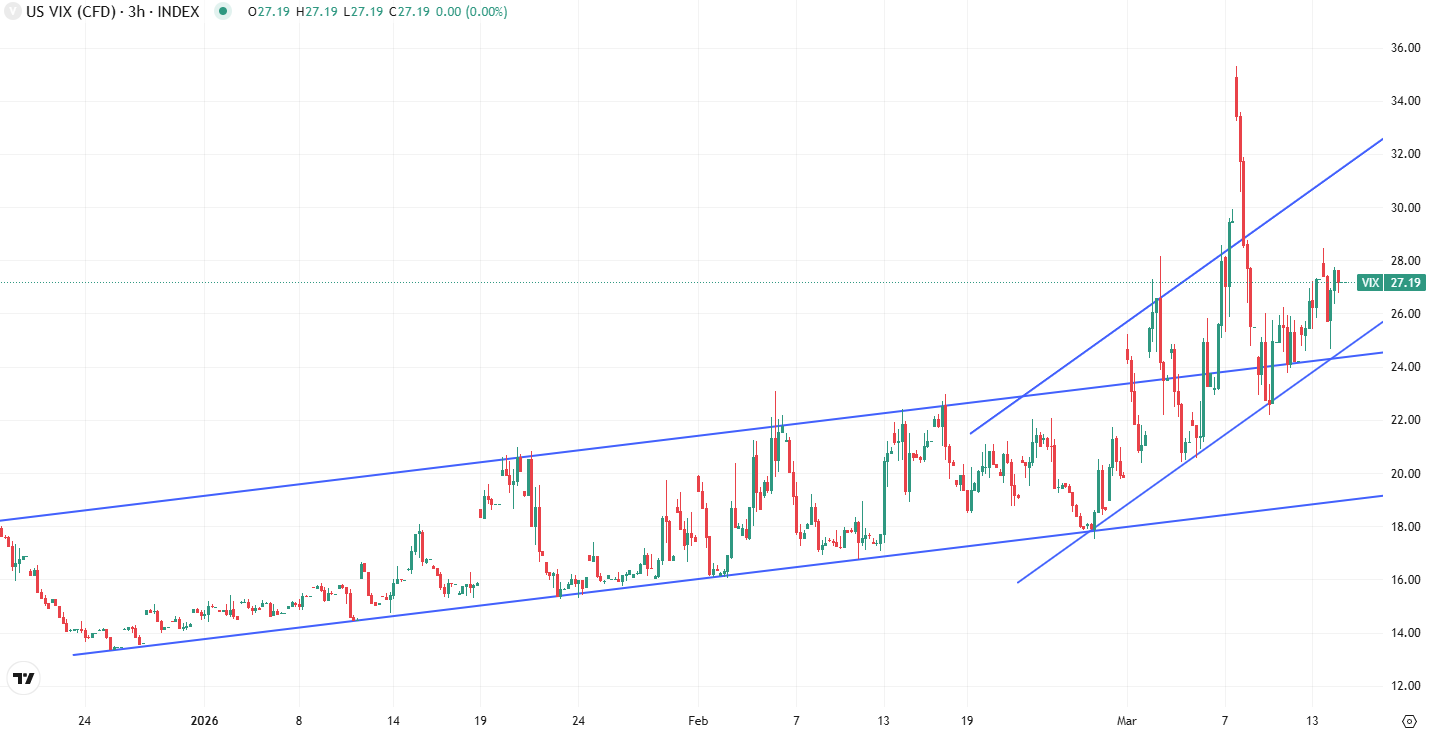 VIX 지수는 이전 시황에서도 언급한 바와 같이 작년 말부터 higher low를 만들며 상승채널을 형성하고 있습니다. 이란 전쟁 발발 이후부터는 더욱 급격한 상승 채널을 다시 만들고 있죠. AI 내러티브가 시장을 지배하는 동안 VIX가 단기 급등한 적은 많았지만, 수개월 이어지는 상승채널을 형성한 적은 없었습니다. 이것만으로도 지금 시장은 달려들 때가 아니라 조심해야 하는 국면으로 보이죠.