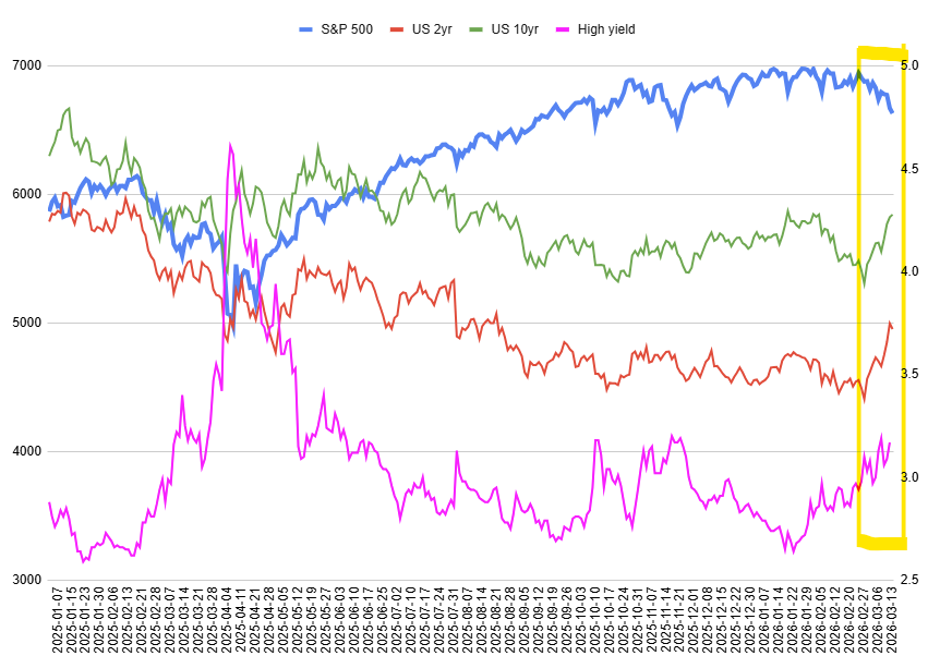 이란 전쟁이 발발한 이후 미국채 금리는 인플레이션 우려, 국방비 부담 급증 등의 영향으로 급격히 상승했습니다. 무위험 수익률의 급등으로 위험자산 가격은 하락세를 이어갔고, 하이일드 스프레드의 상승세는 이어집니다.