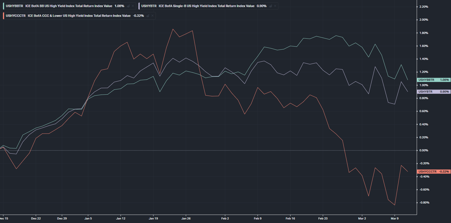 전주에도 언급한 바와 같이 투자 부적격 등급 회사채 가격은 1월말 이후부터 계속해서 하락하고 있습니다 (= 하이일드 회사채 금리 지속 상승). 특히, 가장 등급이 낮은 리스크 온 심리의 바로미터인 CCC 등급 회사채 가격이 가장 크게 하락했죠. 1월 말 이후로는 risk-off 심리가 급격히 강해졌다는 증거로 볼 수 있습니다.