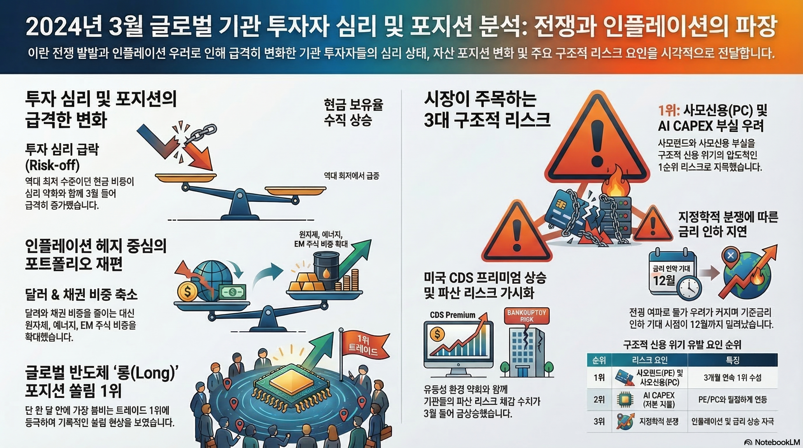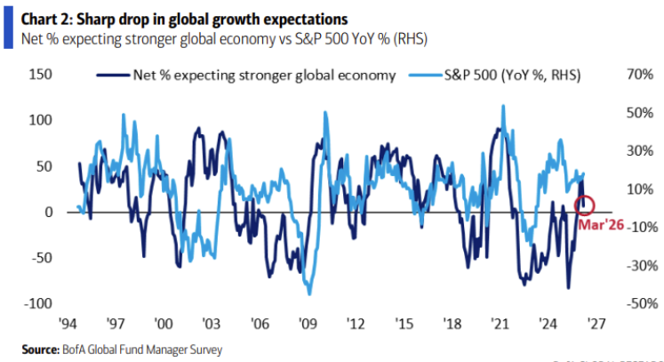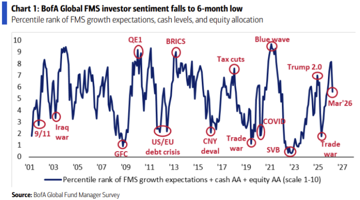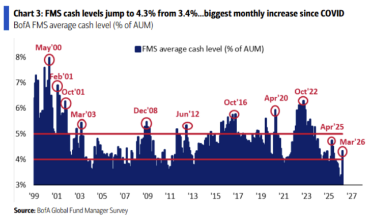 이란 전쟁 발발이 트리거였는지 매우 긍정적이었던 기관 투자자의 심리는 순식간에 급락했습니다. 지난 2월 FMS 분석에서도 언급했었죠. 긍정적이지만 앞으로 더 강해지기는 힘들어 보인다고. 전쟁 상황이 길어질수록 기관 투자자의 심리는 더욱 빠르게 악화될 가능성이 높죠.