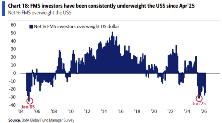 인플레이션에 대한 우려는 곧 화폐가치 절하에 대한 우려와 같습니다. 25년 4월 관세 대재앙 이후 기관 투자자들은 USD에 부정적인 스탠스를 유지하고 있죠. 이번 달에는 소폭 우려가 줄어드는 모습이 나오는데, 어쩌면 지정학 위기에 따른 반응일 수도 있습니다.