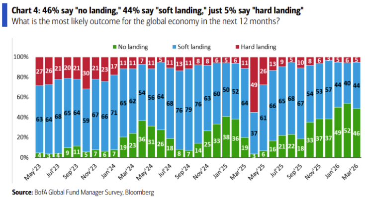 향후 12개월 내 글로벌 경기침체가 올 것이냐는 질문에 여전히 기관 투자자들은 압도적으로 긍정적입니다. 전월에 비해서는 no landing의 비중이 소폭 감소한 정도죠.