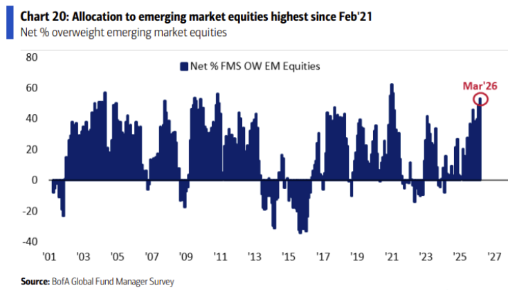약한 달러에 대한 예상이 이어지는 또 다른 경로는 이머징 마켓이죠. EM 주식 비중 확대는 25년 이후로 꾸준히 늘어나 역대 최고 수준까지 늘어난 상태입니다. 현재 레벨에서는 앞으로도 여기서 더 크게...
