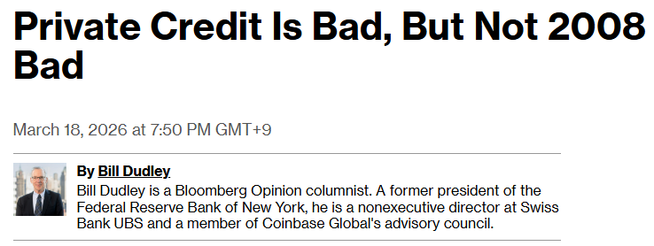 같은 맥락에서 사모펀드, 은행, 보험사 등 주요 이해관계자들도 모두 마찬가지입니다. 어떻게든 투자자들을 안심시켜 환매를 막아야만 하는 입장이니, 당연히 나쁜 이야기는 일절 꺼내지 않을 동인이 매우 강합니다. 따라서, 사모신용이라는 이슈에 한해서는 연준, 은행, IB들의 평가는 상당히 걸러 들어야 합니다.