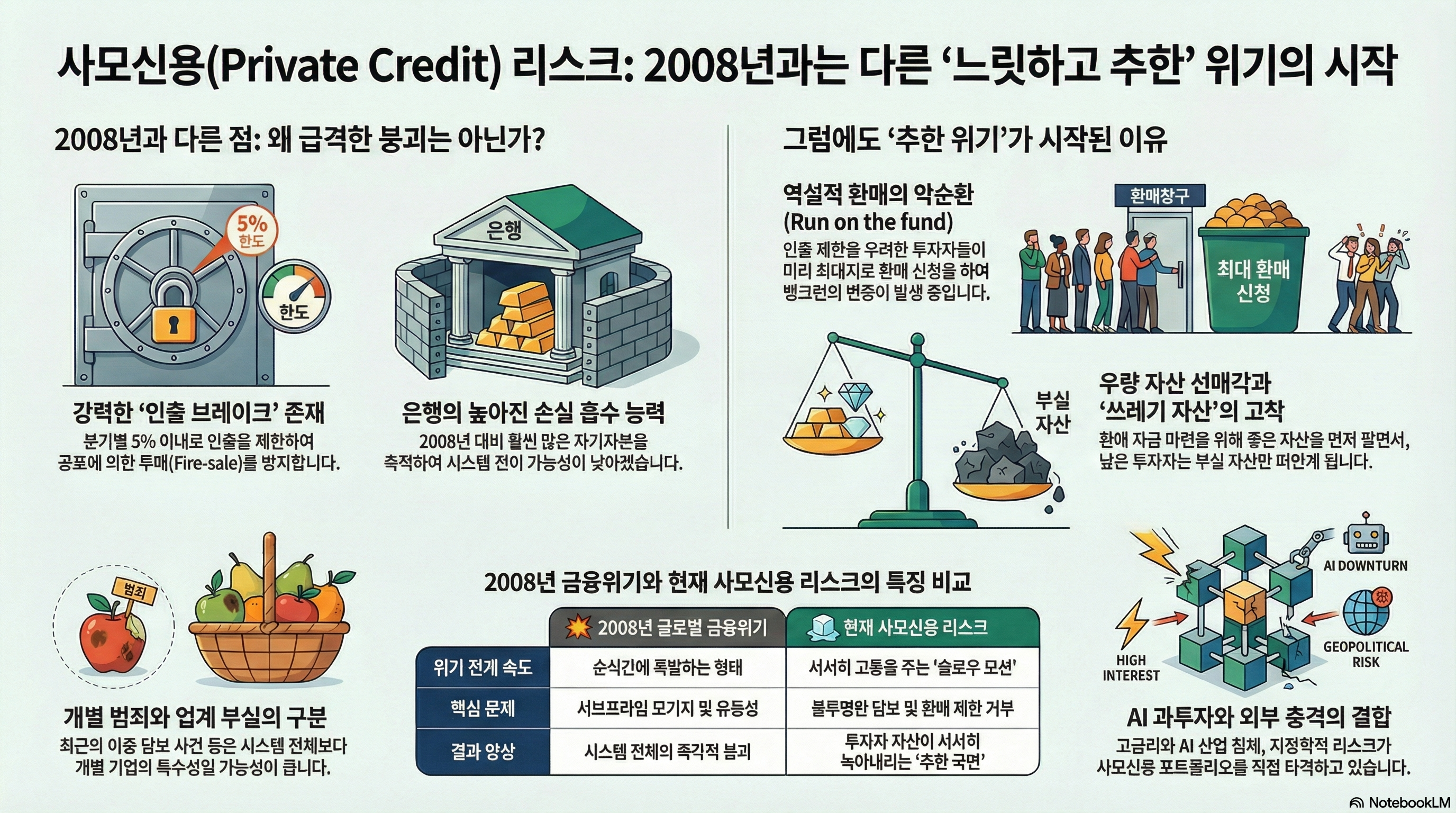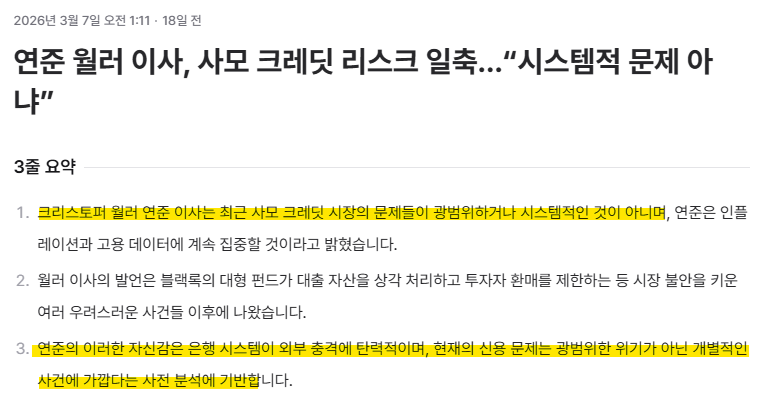 참고로 2008년 글로벌 금융위기가 터지기 직전까지 버냉키 의장은 서브프라임 문제가 국지적이며 전체 시스템에 유의미한 충격을 줄 것이라 예상하지 않는다고 평가했습니다. 2008년에 경기침체가 올 것으로 예상하지 않는다고도 했죠. 연준이라는 조직은 금융 시스템의 안정을 지향해야 합니다. 그런 연준의 주요인사들의 입에서 "사모신용으로 대규모 리스크가 터질거야!!!" 라는 발언이 나올 리가 없죠.