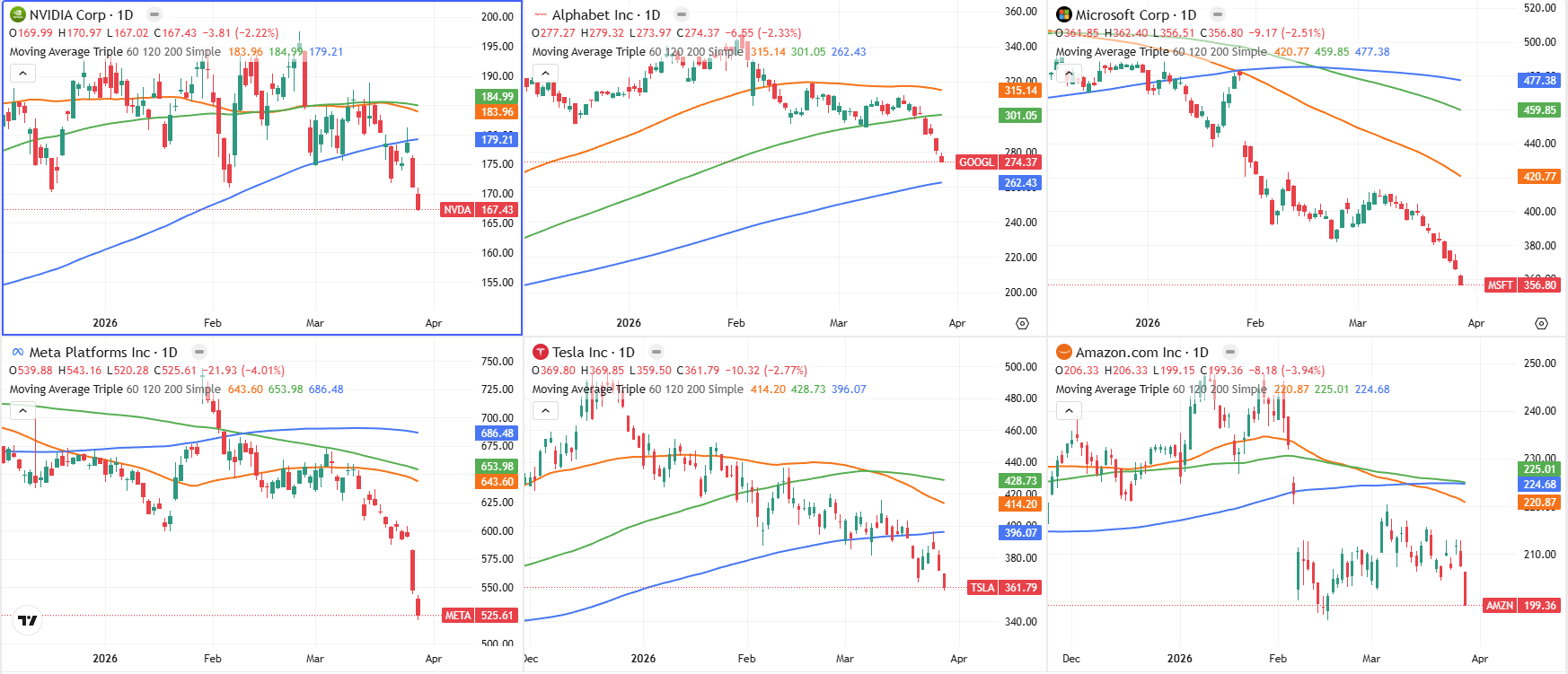 주요 M7 기업들의 주가를 보면 알파벳 정도를 제외하고 대부분이 장기 이평선 (200일) 을 모두 하회하는 수준까지 하락했습니다. 이들 기업들의 forward EPS는 여전히 매우 높은데, 주가가 이렇게까지 하락했으면, forward P/E는 훨씬 크게 하락했겠죠. 즉, 가격적인 매력이 높아진 상태가 되었습니다.