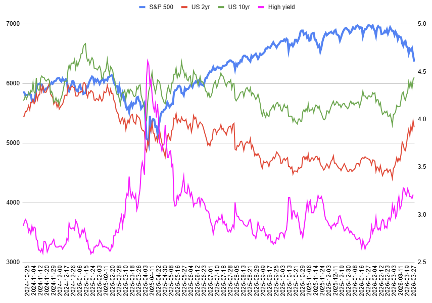 S&P500 지수는 5주 연속 하락을 이어가며 사실상 조정 국면에 들어섰습니다. 같은 기간 미국채 금리가 이란 전쟁 발발 이후 급격한 상승을 이어가고 있습니다. 하이일드 스프레드는 그보다 앞선 1월 하순부터 상승세를 이어갔는데, 최근에는 국채 금리 상승세가 워낙 강해서 하이일드 스프레드가 주춤하는 모습을 보이고 있네요.