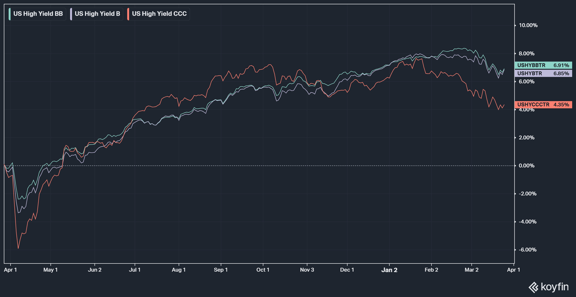CCC 등급 회사채 가격을 시장의 risk-on 심리의 바로미터로 본다면 (가장 신용등급이 낮은 회사가 발행한 회사채 선호도), 시장의 위험선호 심리는 이미 1월 하순부터 꺾이기 시작한 겁니다.