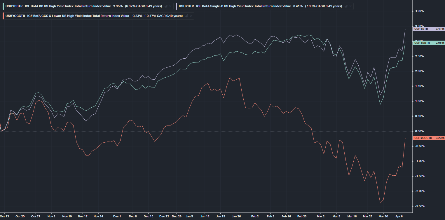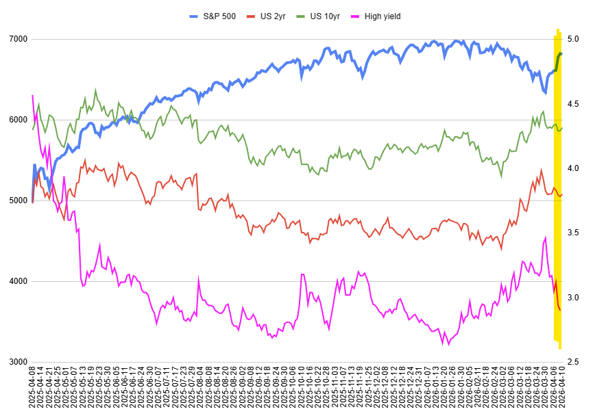 하이일드 회사채 가격도 급등했습니다. 휴전소식과 함께 거의 수직상승했죠. 종전도 아닌 위태위태한 휴전 소식에 드라마틱한 반응을 보인 것을 보면 시장이 심각한 조울증에 걸리기는 했다는 생각이 듭니다 (= 높은 변동성).