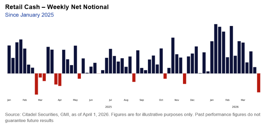 이미 알고 계시듯이 미국이든 한국이든 개인 투자자의 영향력은 상당히 강해졌습니다. 미국증시 상승추세의 버팀목은 개인들의 끝도 없는 BTD (buy the dip) 이었죠. 25년 이후 개인 투자자들은 미국 증시에 끝도 없이 돈을 밀어넣었습니다. 특히, 위 차트에서 보다시피 이 추세는 2026년에 들어와 훨씬 강해졌죠.