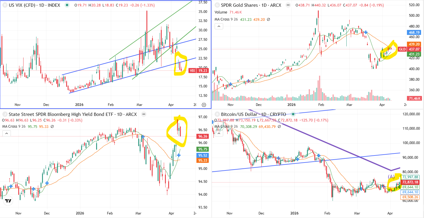 종전선언 이후 리스크 선호 지표들을 보면 VIX는 급락하여 올해 초부터 형성된 하단 추세선을 깨고 내려가 버렸습니다 (좌상). 앞서 살폈던 하이일드 회사채 역시 갭등하며 심지어 최고점을 넘어서버렸죠 (좌하). 재미있는 점은 과거에 가장 인기있었던 자산들의 반응은 조용했습니다.