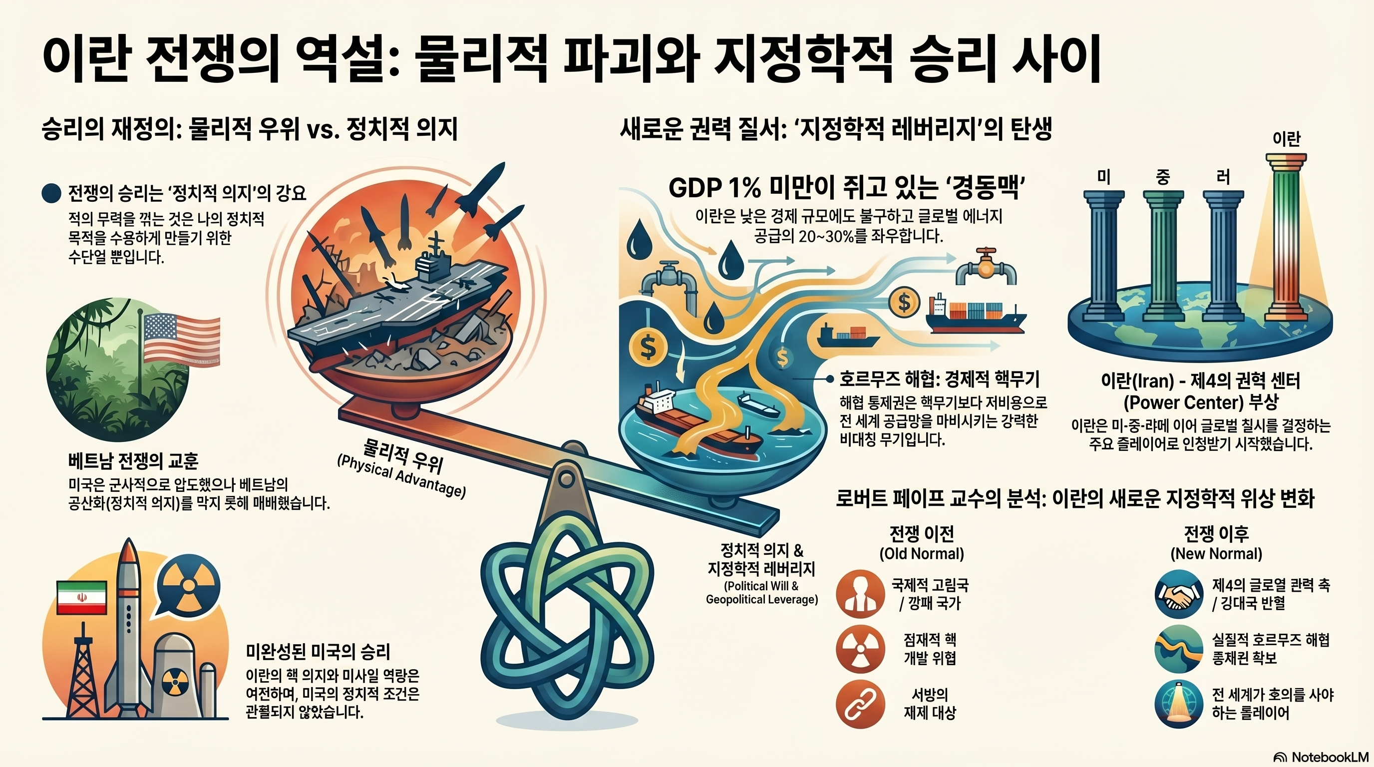 이란 전쟁 상황에 대입해 봅시다. 물리적 강자인 미국은 압도적인 힘으로 물리적 약자인 이란을 몰아쳤습니다. 단기간에 핵심 지도층이 몰살당하고, 군사적 저항수단은 상당 부분 무력화되었습니다. 그런데, 이러한 물리적 공격의 결과가 이란에게 더욱 큰 레버리지를 ...