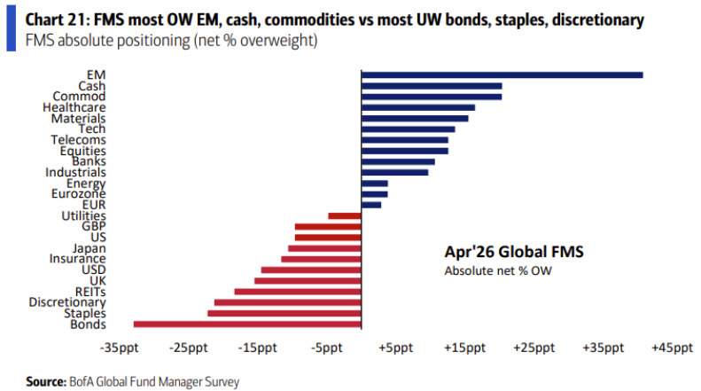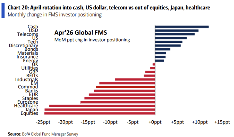 기관 투자자들의 자산 배분 비중. 이머징 마켓 비중이 여전히 매우 높고 (전월보다는 감소), 현금의 비중은 증가했습니다. 왜 현금 보유율이 3월과 동일한지 계속 의문이군요. 헬스케어 비중도 전월 대비 크게 감소했고, 무엇보다 주식 비중 자체가 전월 (약 40ppt) 대비 크게 감소했습니다 (약 15ppt).