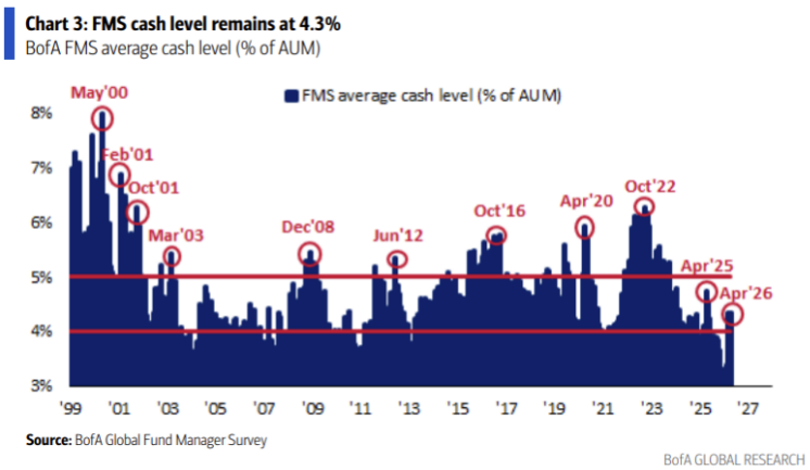 기관 투자자들의 현금 보유율은 지난달과 거의 동일한 4.3%를 기록합니다. 심리에 비해서는 현금 보유비중이 크게 높아지지 않았군요. 심리는 악화되었지만 뭔가를 사기는 했다는 말이죠.