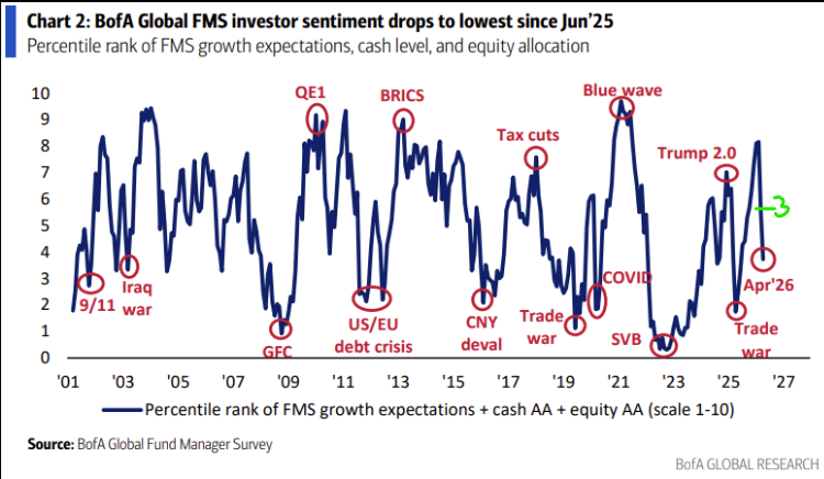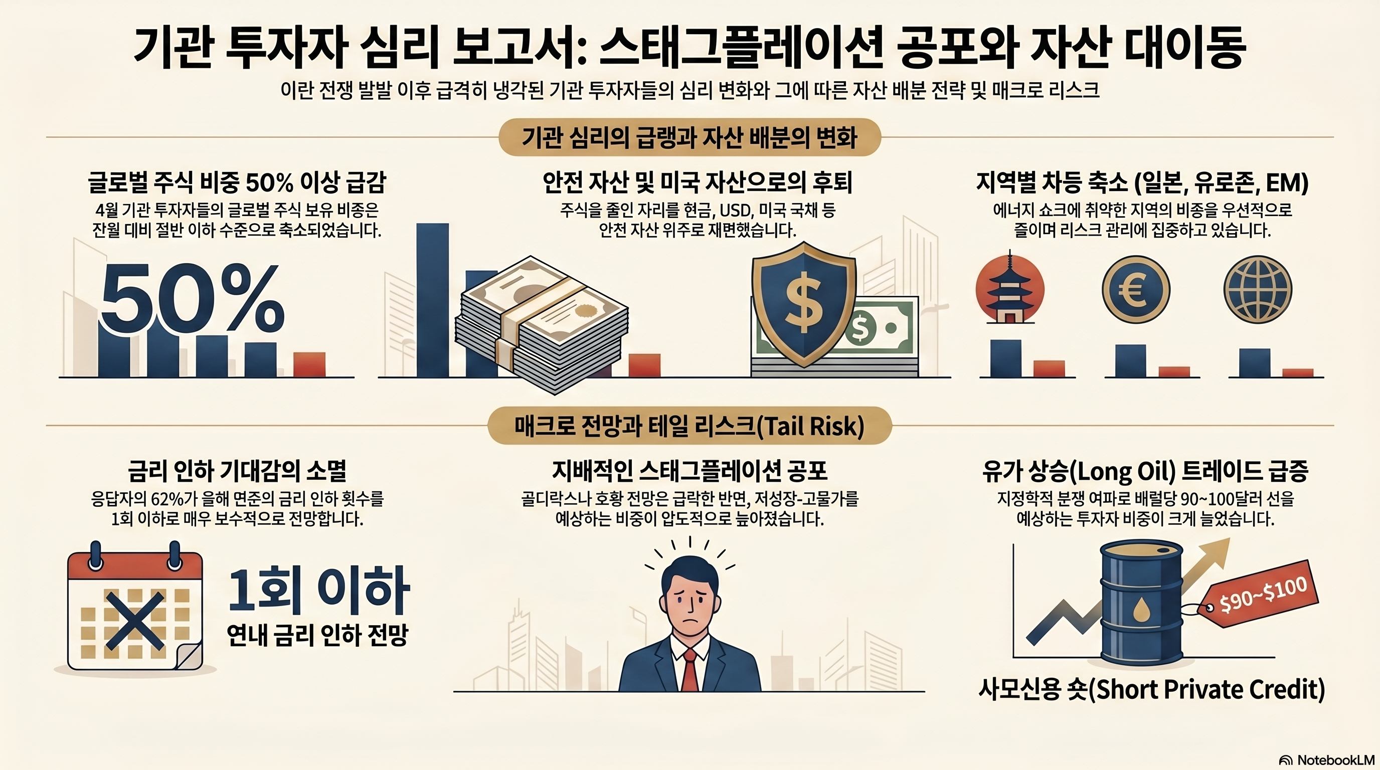 이란 전쟁 발발 이후 두번째 FMS... 지난 달에는 고점에서 급격히 꺾인 기관투자자들의 심리를 짚었었죠. 이번 달에는 한층 더 심리가 악화된 모습을 보여주고 있습니다.