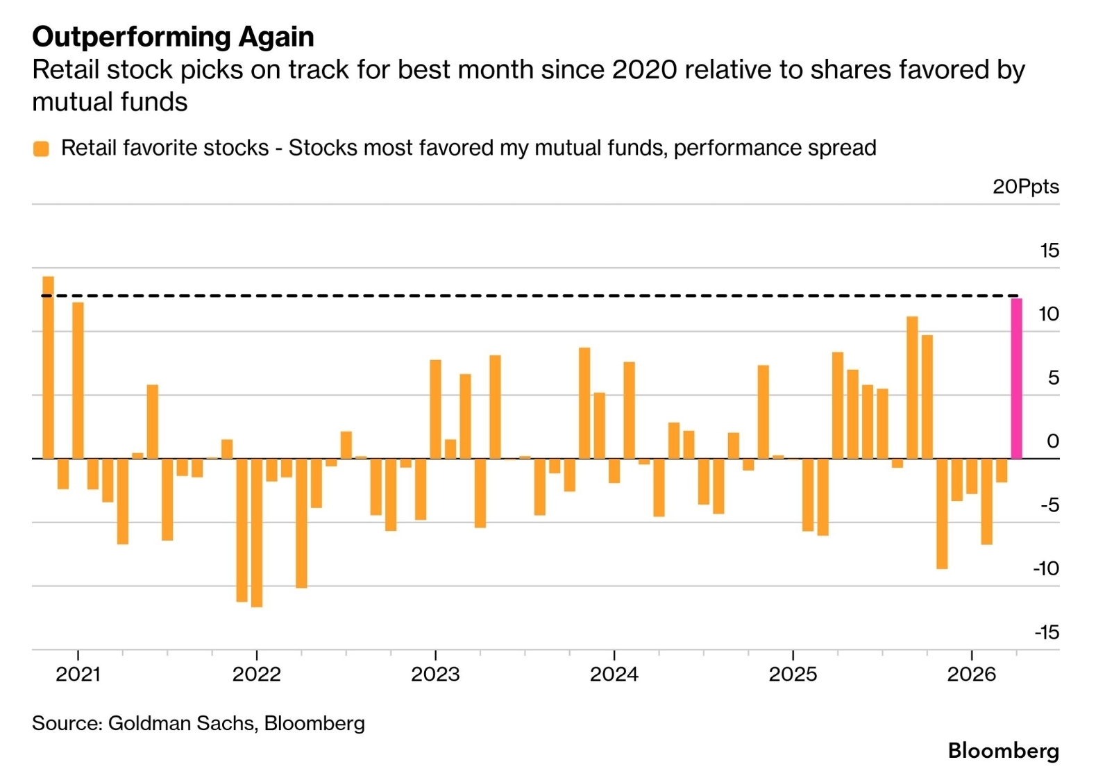 개인 투자자들이 좋아하는 종목들과 뮤추얼 펀드들의 최선호 종목들의 수익률 스프레드입니다. 4월에 아닌 밤중에 홍두깨처럼 역대 최고 수준으로 치솟았습니다. 25년은 특히 개인 투자자 선호종목의 상대성과가 좋았는데, 특히 25년 4월 관세 대재앙이 있은 후에 그러했죠. 이 추세는 미국 주가지수의 상승세가 둔화되기 시작하면서 꺾였고, 4월에 급격히 반전된 겁니다.