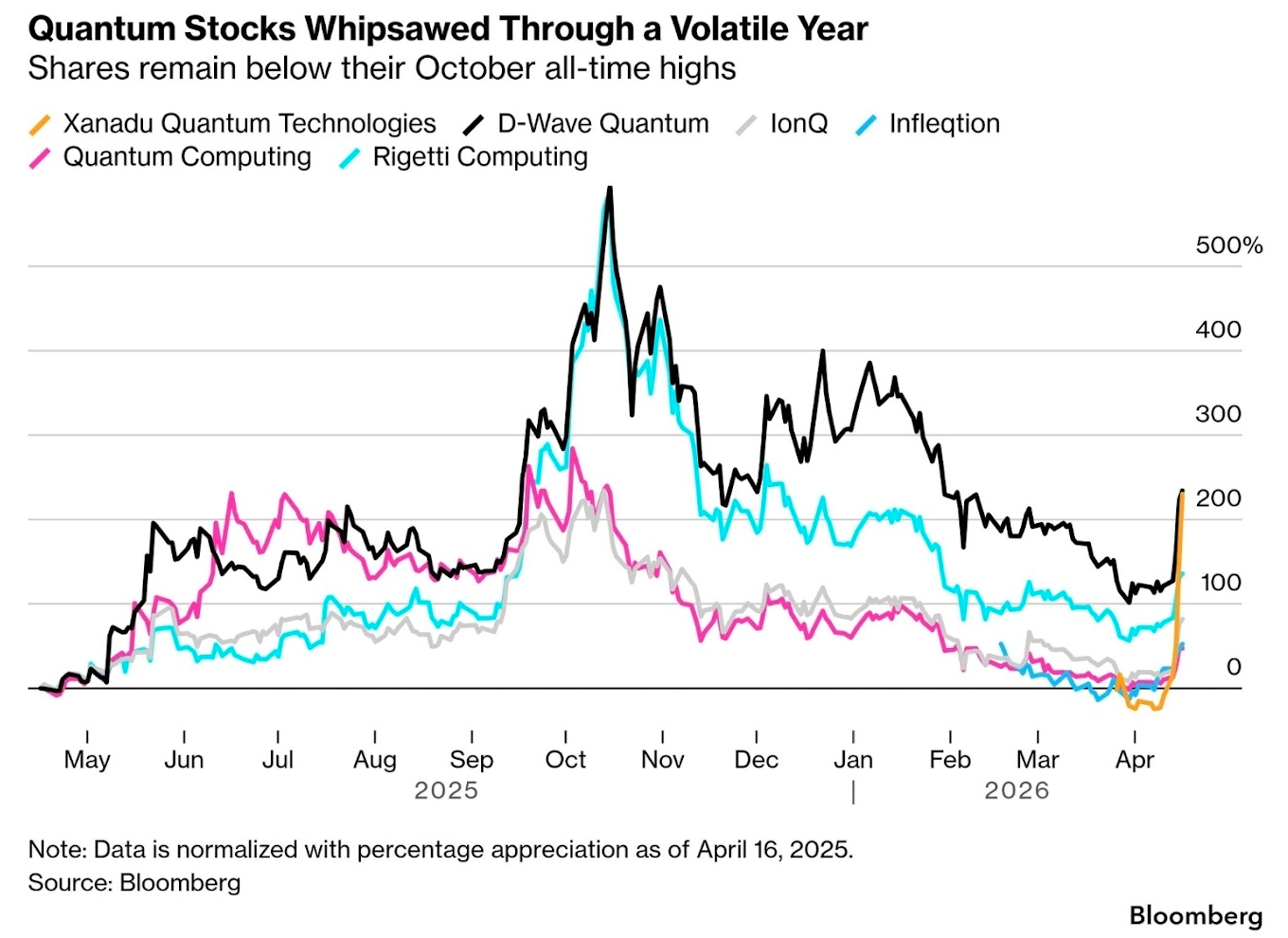 하지만, 현재 시장의 광기를 극명하게 보여주는 사례는 양자 컴퓨터 관련주들이라고 봅니다. 엔비디아가 자사의 오픈소스 모델이 양자 컴퓨팅 연산오류를 혁신적으로 줄여준다고 '주장' 했더니, 양자 컴퓨터 주식들이 수직상승합니다. 순손실 7천만 달러가 넘는 Xanadu의 경우, 불과 3거래일만에 225% 상승하며 밈 주식의 왕좌에 올랐습니다.