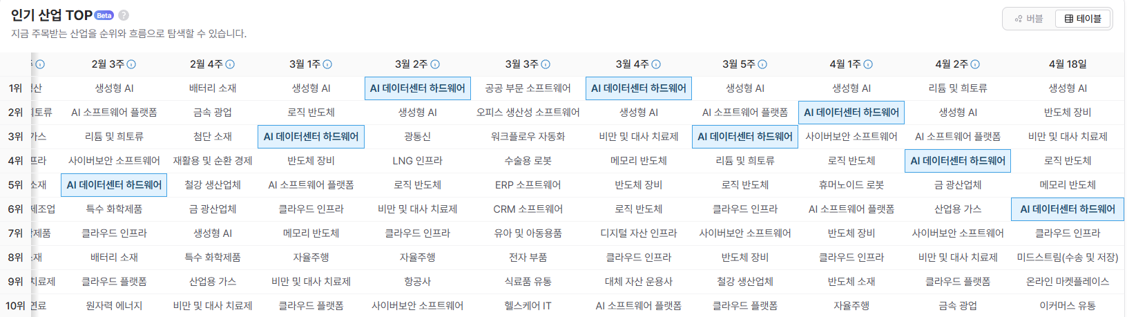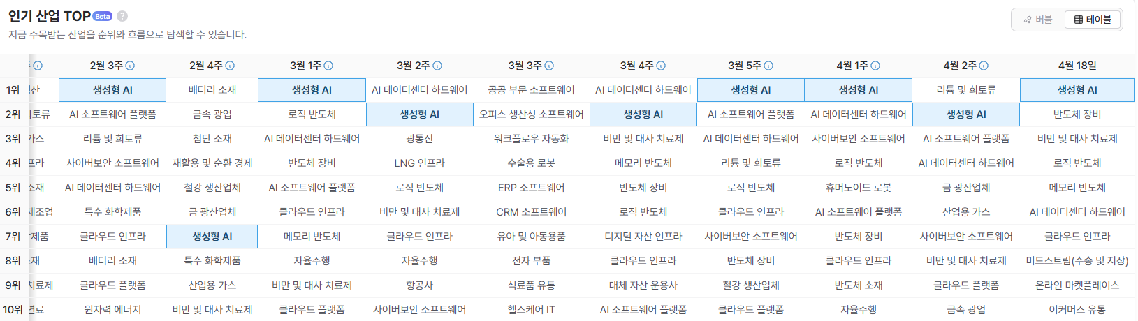 어쨌든... 여기서 조회되는 순위는 화면 안내에도 포함된 것처럼 1주일 단위 뉴스, SNS 등을 종합해 시장의 주요 관심산업 혹은 주제의 변화를 나타냅니다. 하이라이트한 '생성형 AI' 와 'AI 데이터 센터 및 하드웨어' 를 보면 (직접 해보시면 아시겠지만), 이란 전쟁이 발발한 이후 1, 2위로 급부상했습니다. 짐작컨데 이란 전쟁이라는 거대한 사건이 벌어지자 결국 믿을 건 AI... 그리고 AI에 대한 자본투자... 이렇게 시장의 관심이 옮아간 것 아닌가 생각됩니다.