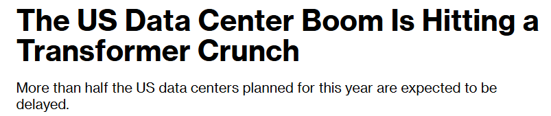 4월 2일, 블룸버그에 변압기 수급이 원활하지 않아 2026년 계획된 미국 내 데이터 센터 중 50% 이상이 계획 지연 혹은 취소되고 있다는 기사가 올라왔습니다. 50% 이상이 지연 혹은 취소되었다는 결과는 매우 충격적이지만, 변압기 수급 병목은 이미 오래전부터 예견되었습니다.