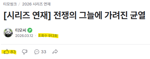 이 아티클 역시 조회수는 평균 이상, 좋아요 비중은 평균 이하를 기록했죠. 두 아티클 모두 조회수가 900회가 넘었다면 평균에 비해 (약 600회) 꽤 많이 나온 편이지만, 좋아요의 비중은 장기평균에 상당히 못 미쳤다... 이건 청중들이 관심은 많지만, 동의하지 않는다 혹은 듣고싶지 않다... 대략 이런 거겠죠?