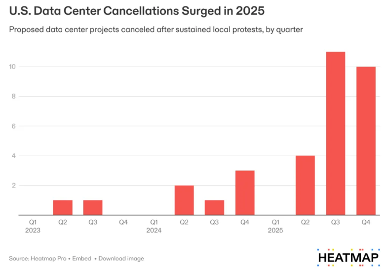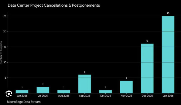 이전 아티클에서도 언급했다시피, 미국 내 데이터 센터 구축 계획의 취소 케이스는 급격히 늘어나고 있습니다. 이미 25년부터 시작되었고, 26년에 들어와 더욱 급격히 늘어났죠. 이제는 그 비중이 50% 이상으로 늘어난 겁니다.