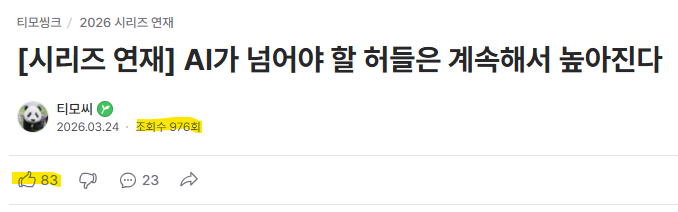 주 평균 4회 이상 지속적으로 글을 올리면서 업로드한 제 글의 모수가 커지면서, 경험적인 하나의 패턴이 드러났습니다. 좋아요의 갯수가 조회수의 약 10% 정도로 유지된다는 거에요. 위 아티클의 경우, 이 통계적 패턴에 의거하면 좋아요가 약 97개 정도는 나왔어야 하지만, 83개에 불과하죠?