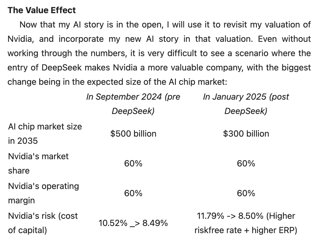 다모다란교수님은 Aswathdamodaran - new message(Feb 2.)에서 DeepSeek의 AI 시장 진입이 AI 내러티브를 변화시키고 엔비디아와 같은 기업들의 지배력에 도전한다고 주장하며 그 영향에 대해 논의합니다.