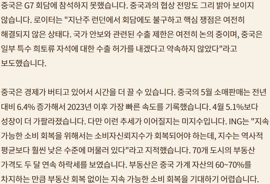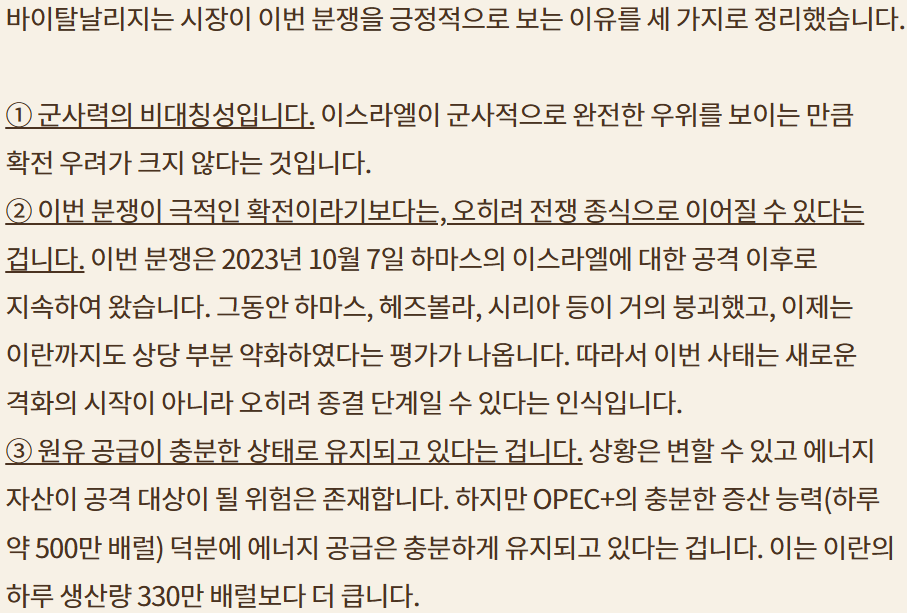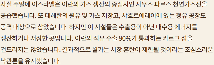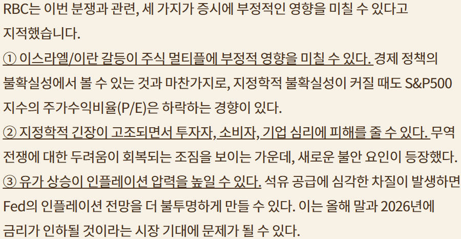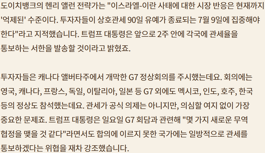 2.지난 주말 이스라엘-이란 사태는 마무리되면서 이번주 시장의 방향은 G7회원 중간중간 관세 문제와 금요일의 Triple witching dasy에 포커스가 맞춰짐