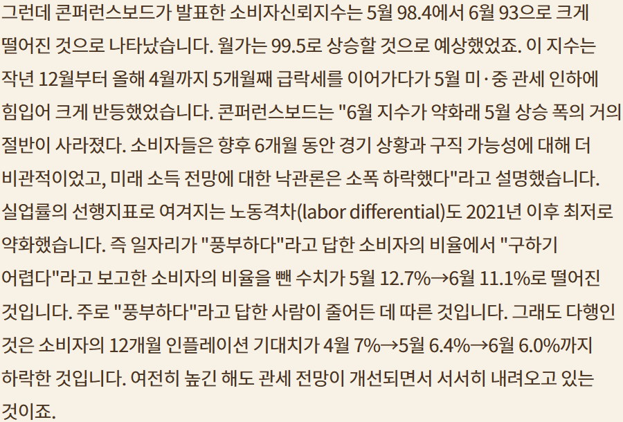 Conference Board 소비자 심리지수 하락; 경기 침체 조기 신호로 실업급여 청구 증가/여행 수요 감소; 카니발 등 여행 관련 실적은 견고