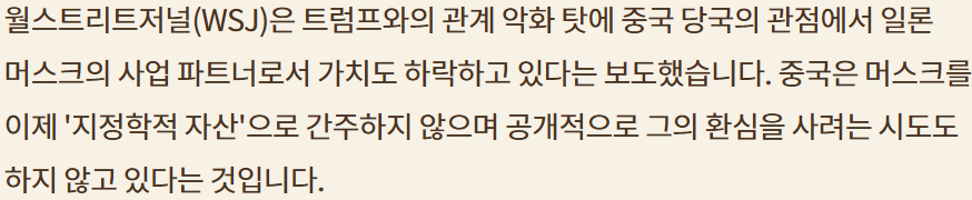 트럼프 신당창당 여파 테슬라 급락: 전기차 보조금 폐지 관련: 중국 더 이상 머스크를 지정학적 자산으로 생각하지 않을수도