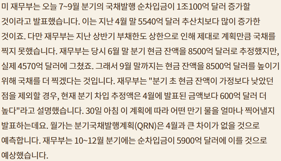 QRA 발표; 순차입금 비슷하나 장기물은 이전과 비슷할것으로 전망; 예상대로 단기물 먼저 풀어 가격을 떨어트리고 장기물 작업 들어 갈듯. 역레포잔고와 TGA 잔고 추이 확인 필요 ==>유동성에 한번 춤 출듯