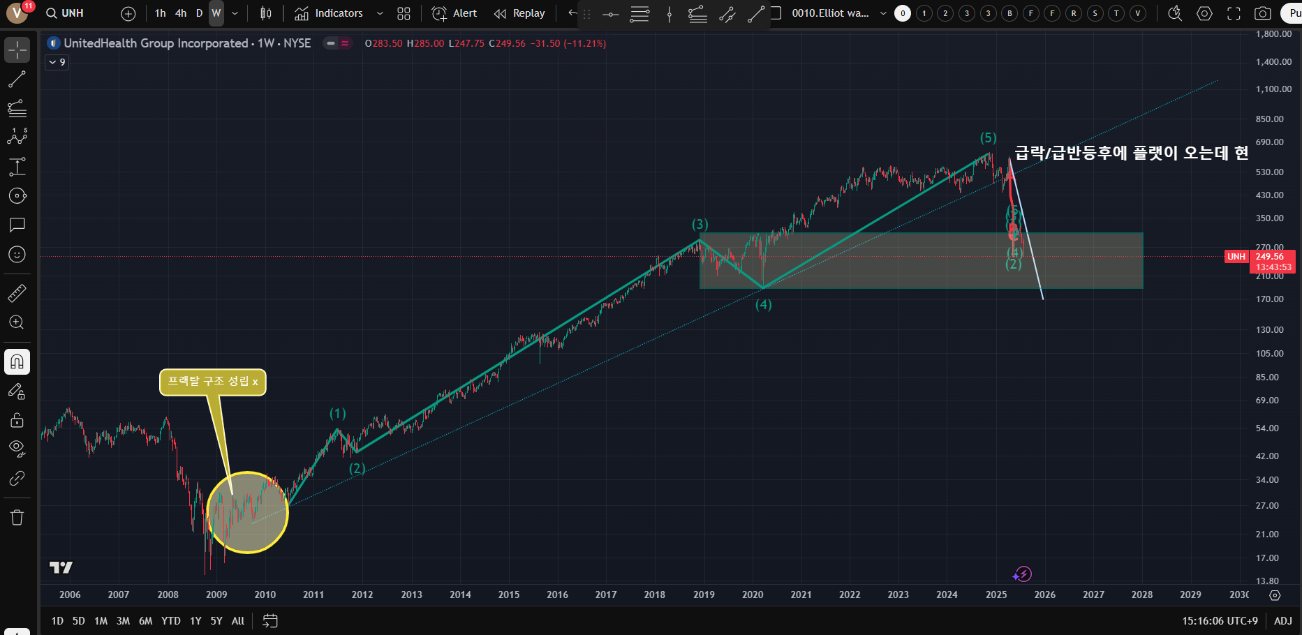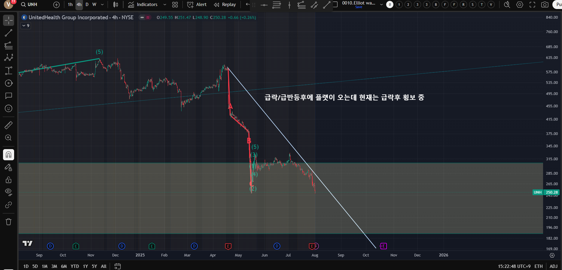 떨어지는 칼날은 잡지 말라. 고개를 돌려 UNH를 보라. 지난 저점은 가까스로 지켰지만 여기를 깨부시는 순간 지옥문이 열릴듯...무릎에서 사서 (하락에서 상승으로 확실한 방향 전환 확인 후) 어깨에서 팔아라(상승을 멈추고 하락 추세가 확실할때)격언을 항상 되새기며...트럼프 집권동안 UNH는 계속 우울할듯