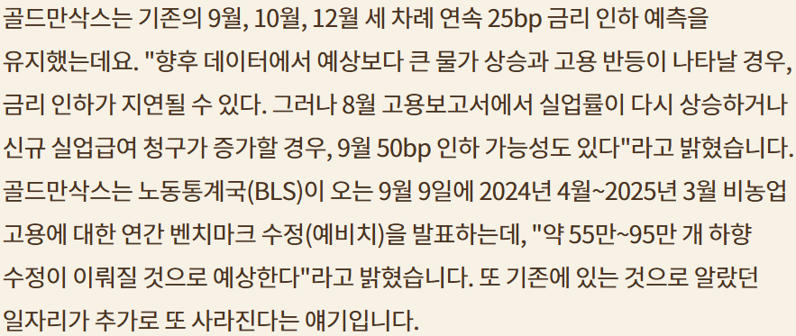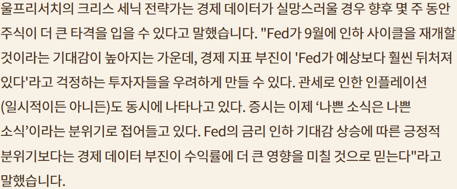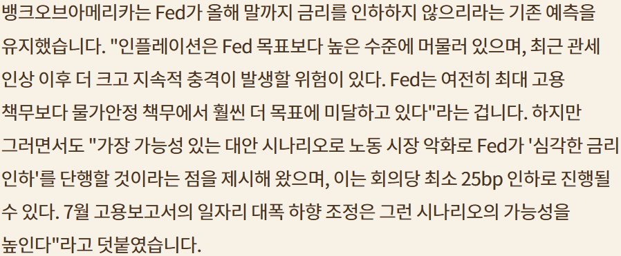금리 인하 가능성 높아져;9월 FOMC까지 여러 데이터를 좀 더 보고 결정하겠지만 파월의 마지막 잭슨홀 미팅인 만큼 확실히 신호를 줄듯; 인플레냐? 침체냐? 스태그플레이션 위험은 있지만 그래도 성장이라면 50bp 인하 가능성도 충분