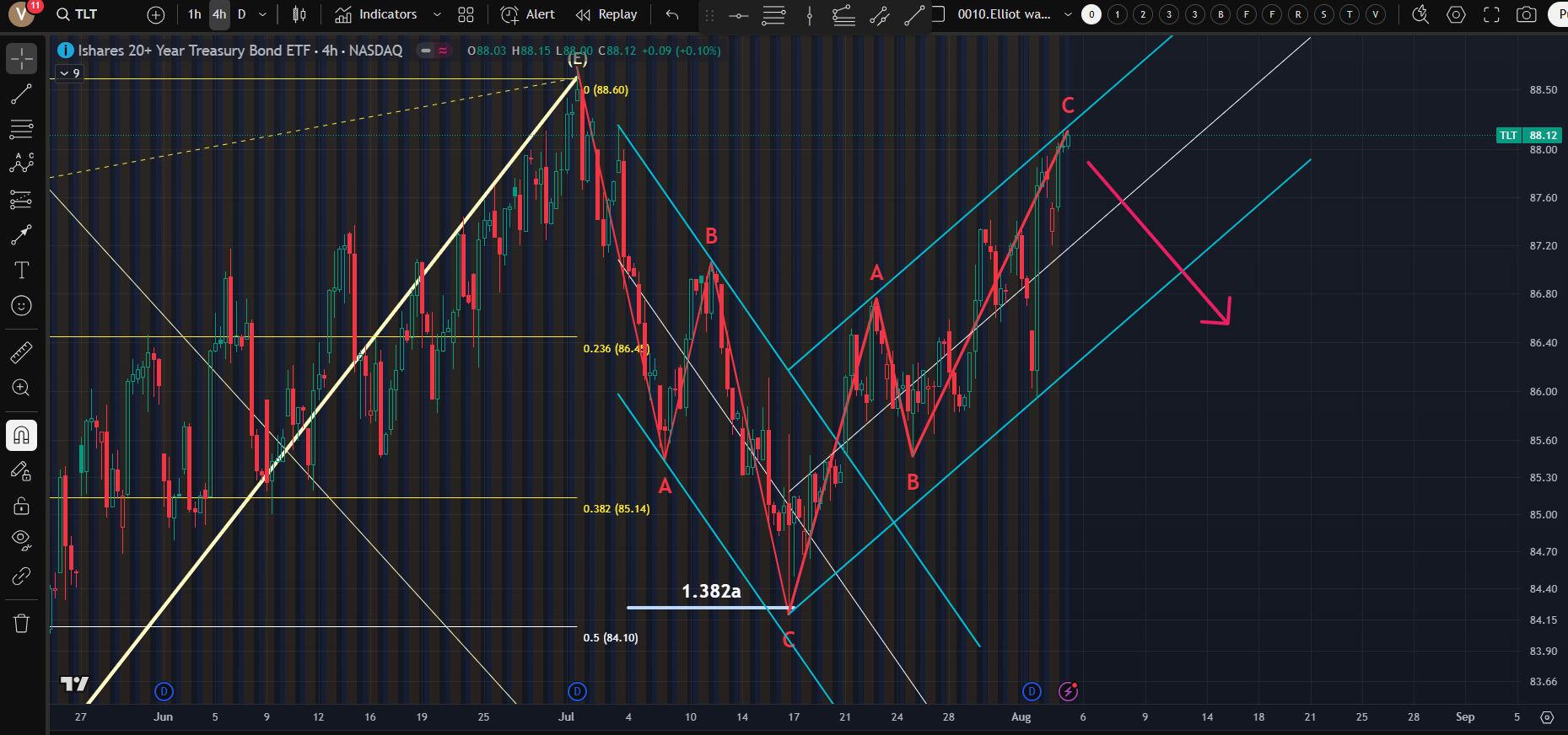 [삼각형 a의 1.382만큼 되돌림 주고; 채널을 따라서 지그재그로 상승중(임펄스와 달리 지그재그는 채널을 따라서 진행) 채널을 따라서 상단에 부딪힌후 다시 한번 하단 터치 예상하나 다음방향은 어디로 갈지는 모름. 큰 그림으로 보면 국채 가격이 하락후 계속 하락 및 횡보중이라서 읽기가 힘들다; 금리와 달러는 귀신도 모르는데]