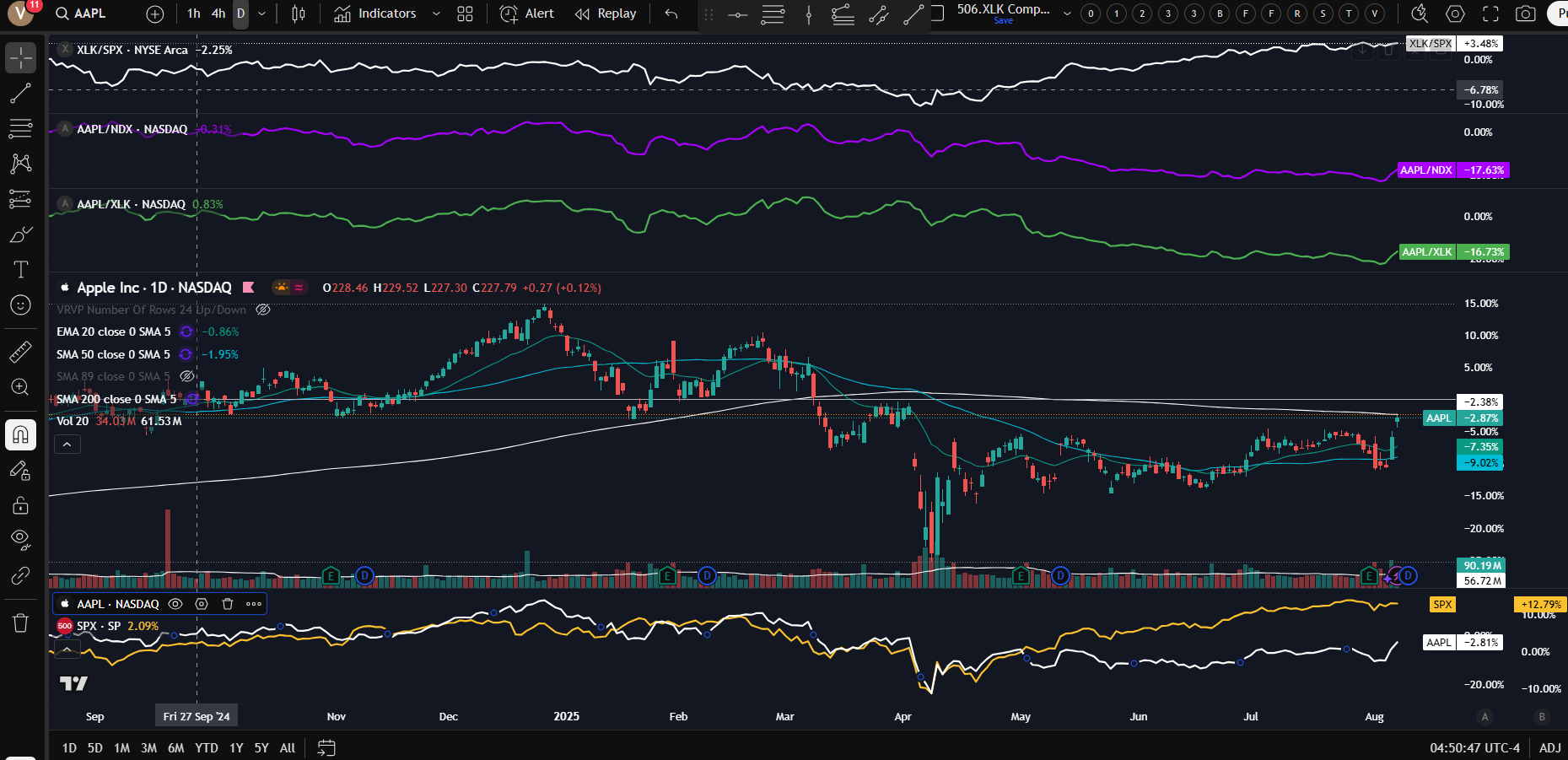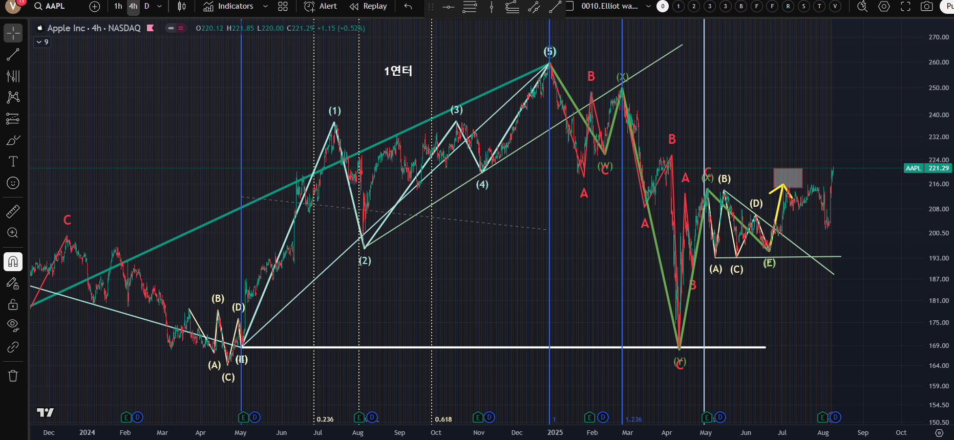 반도체 관세와 애플의 직접투자로 상승중;MSFT, NVDA 등에 비해 부진했지만 모멘텀을 타고 있음