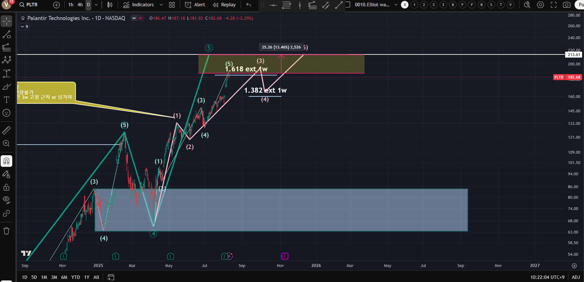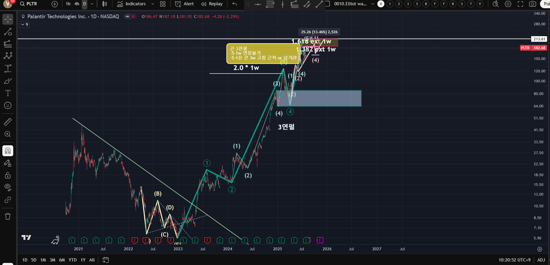 [큰 3파 연장 임펄스는 유효하므로 조건에 모순이 생기지 않게 5-1파를 수정...그러면 CPI로 조정이 온다면 5-4파 형성후 다시 5-5파 형성 가능; PLTR의 베타값은 2.59로 SPX 5% 움직임 필요한데...소름돕게도 5파 연장 임펄스로 변경되면 최소 도달값과 비슷함;이 시나리오가 가능해도 상투잡힐 확률이 매우 높기 때문에 진입은 어려움]