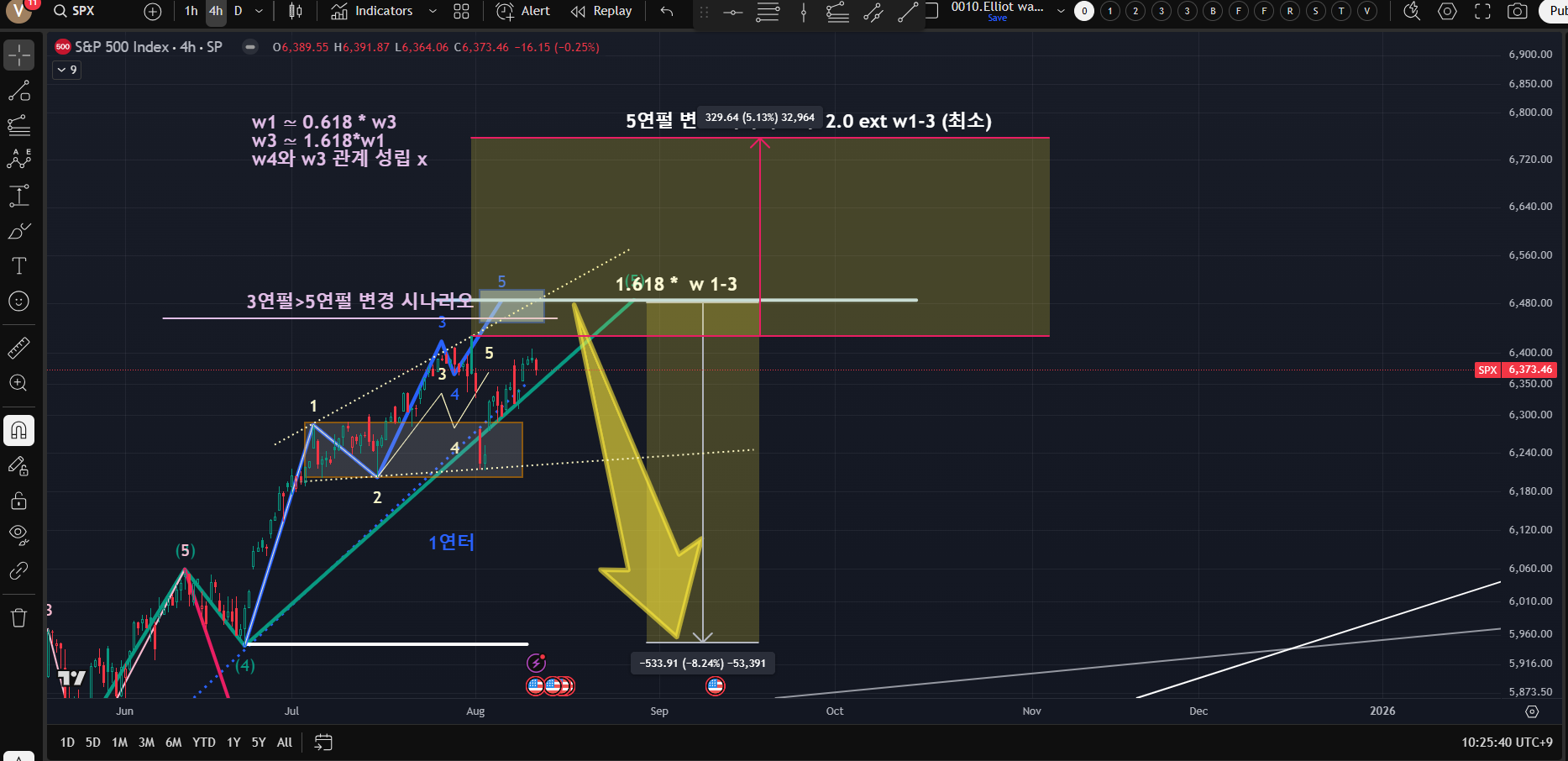 [원안은 3파연장 임펄스(하지만 5-1파 연장 모순 발견);최근 급락을 4파로 보고 5파로 조금더 진행해야 한다면 CPI 후에도 상승 가능( JP Morgan 보합내지 상승이 75% 예측);25%확률로 하락한다 하더라도 프랙탈 관점으로 5-5파 일부이기때문에 아직 큰 파동이 마무리되지 않음; 또한 절단 or 미달로 끝난다면 3파 연장 임펄스에서만 가능;5파 연장임펄스로 뷰로 바뀔려면 6456 즉 1% 상승만 나와도 시나리오가 minor 변경부터 파동전체 수정이 필요한 Major까지 모두 가능...참 어렵다...시장이 고점이 오고 있기는 하는데 아무도 그 끝을 알수 없으니]