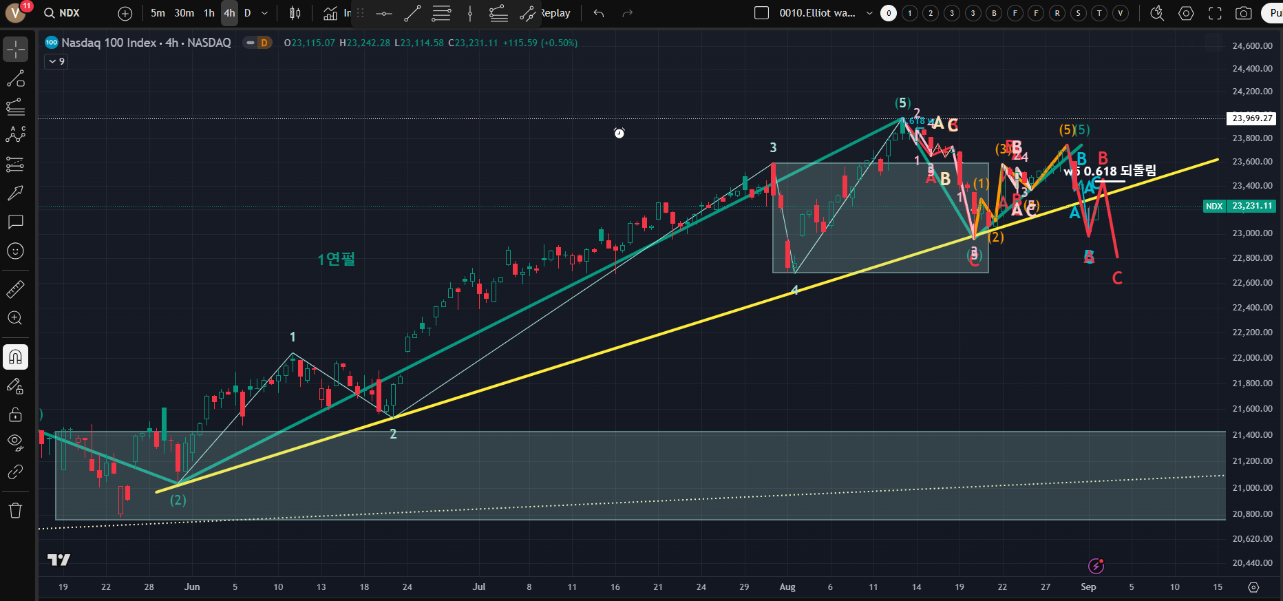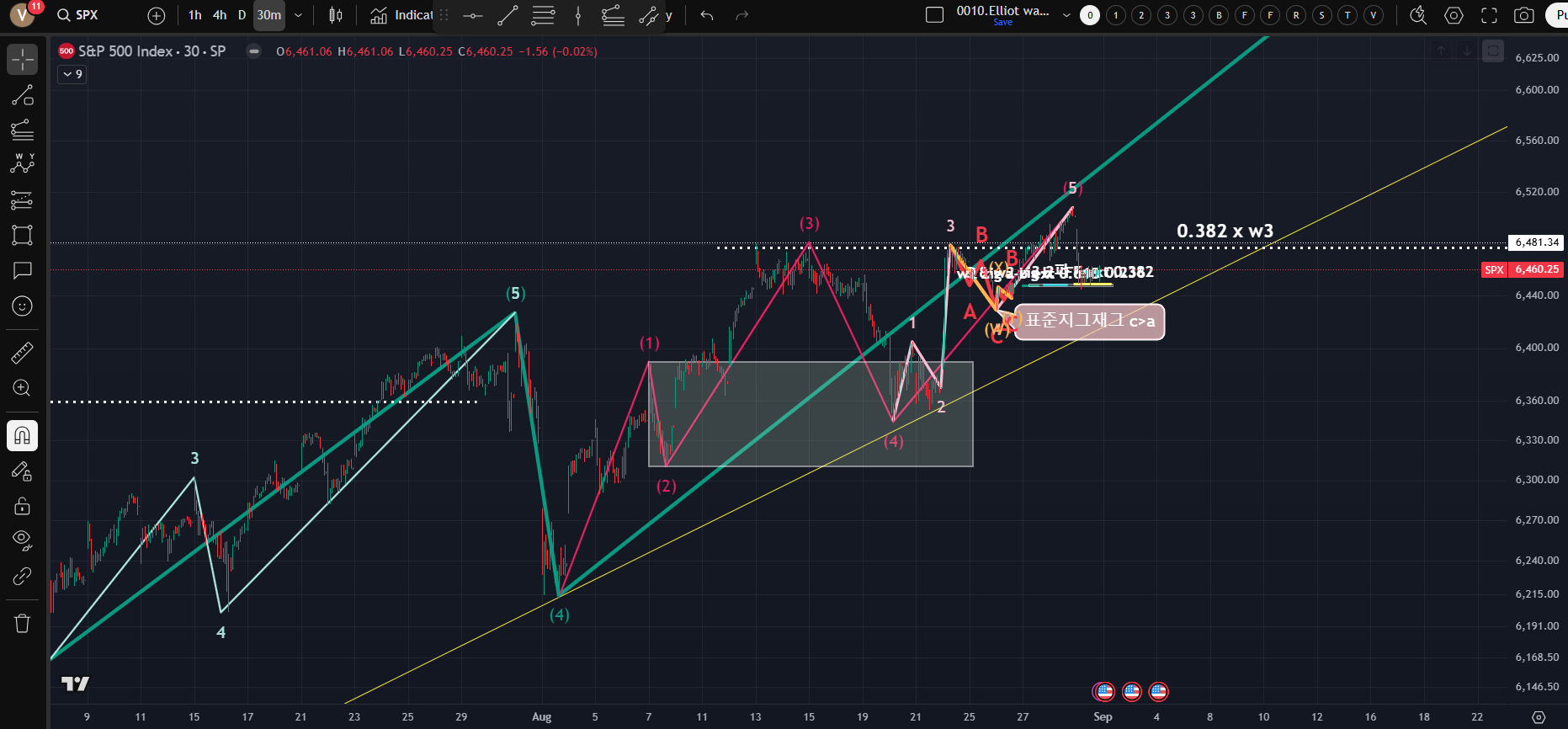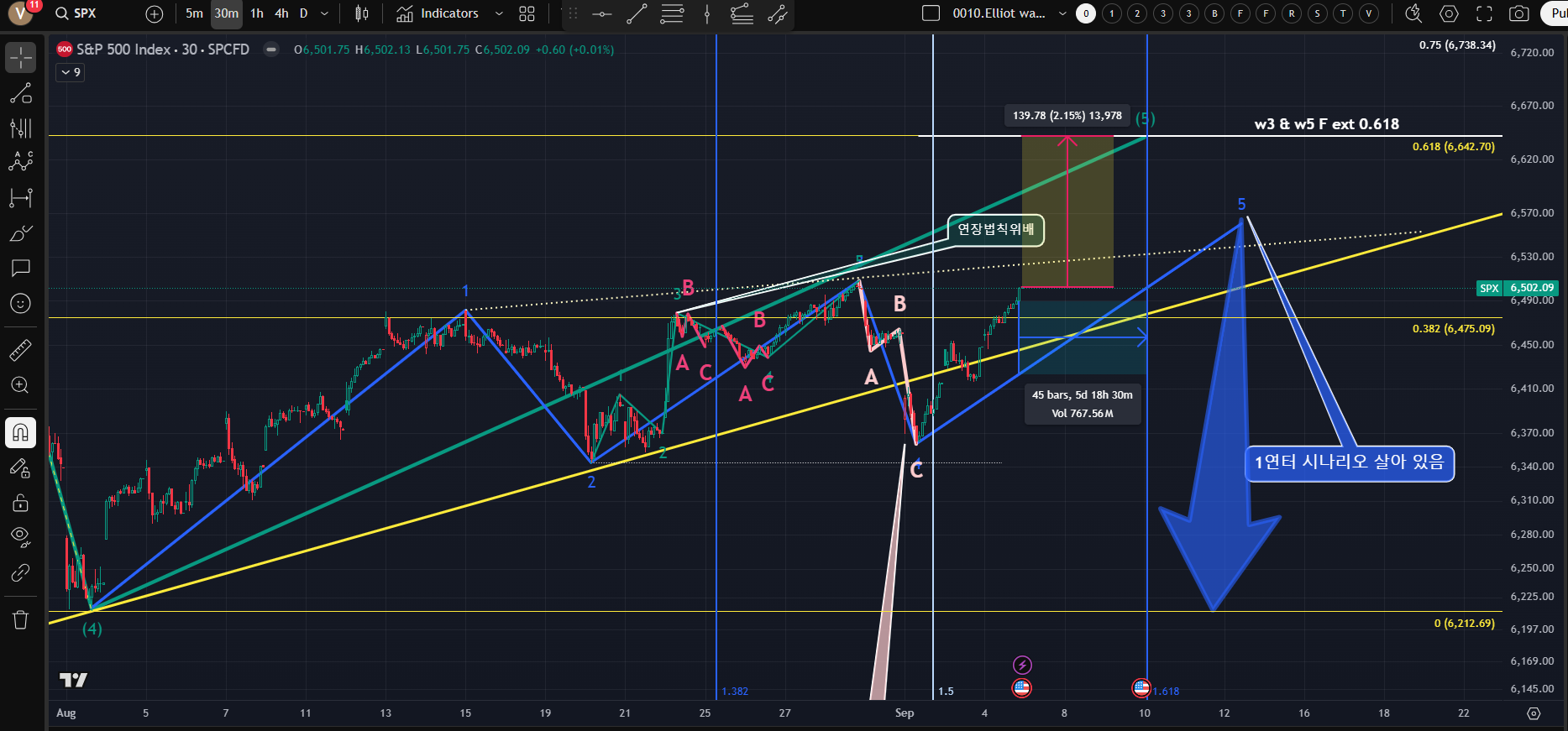 [blue line의 1파 연장 터미널이라면 1-3파 추세선을 뚫어야한다(yellow dotted line); 큰 충격파의 3파와 5파 사이의 파동 균등 법칙(현재 1파 연장 충격파 시나리오)을 통해 예상지점을 예측해보고 Play book을 만들어 볼수 있다; ① 3파와 5파의 크기 비율로 보면 6642까지 2.15% 여유가 남아 있다 ②파동균등의 법칙은 시간상으로도 존재가능하다고하면 Fibonacci time zone으로 보면 5~6일 정도 남아있다; 즉 다음주가 탑이 나온다는 소리인데...금리인하는 시장에 반영되어 있으니 어떤 악재로 떨굴려는지...혼자 망상중이다]