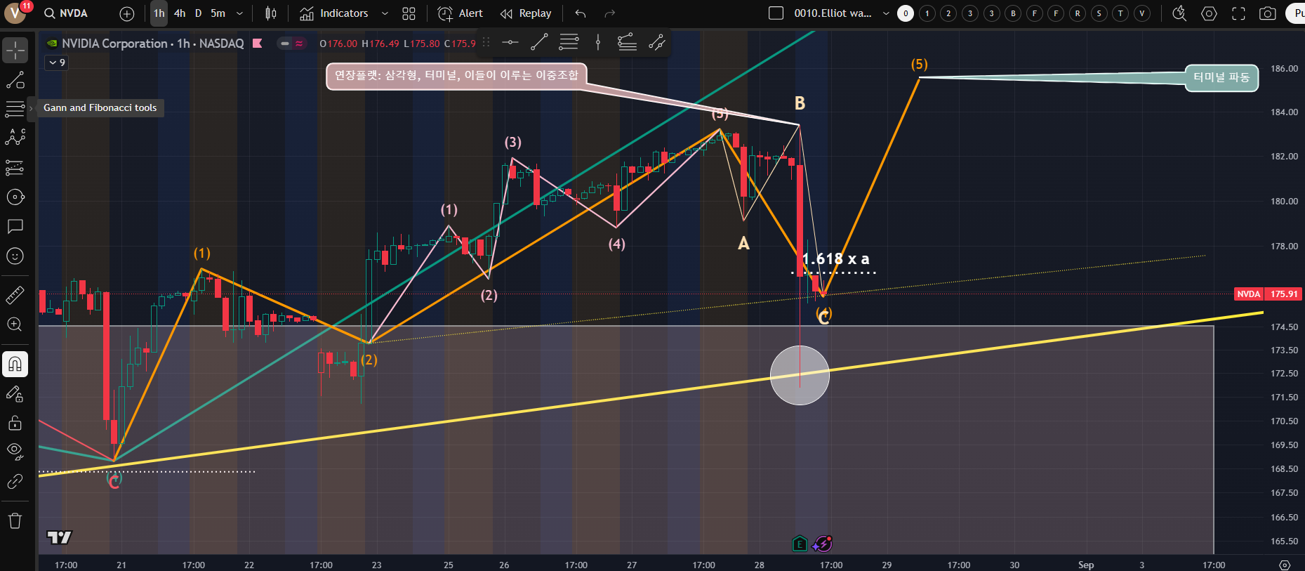 [5-3파 내부의 하위 파동의 연장의 법칙에 모순이 생긴다. 아직 충격파 진행이라면 에누리로?]