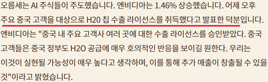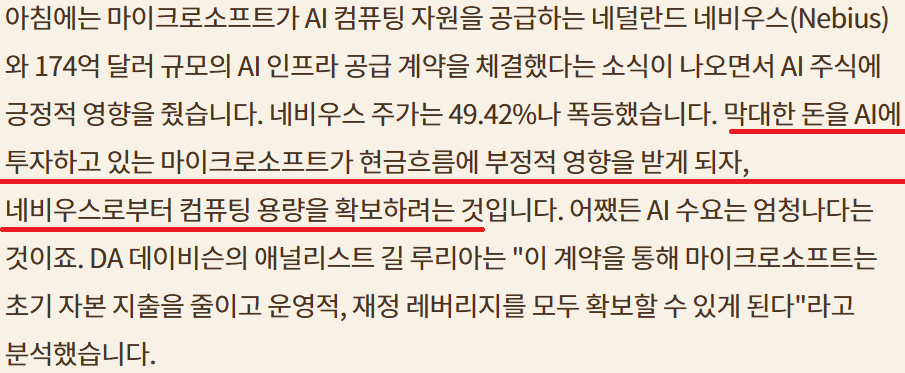 AI 관련 시장 주도; $NVDA H20 칩 중국 라이선스 확보;$MSFT 비용절감위해 네비우스 컴퓨팅 용량 확보;ORCL 인프라 수요 지속