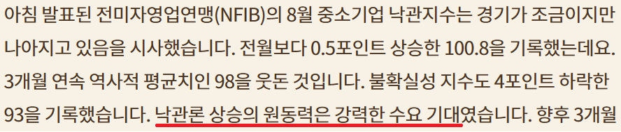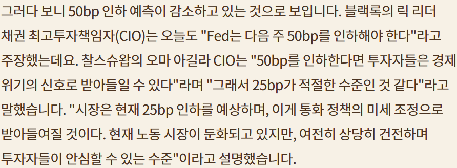 금리 인하는 오히려 25bp가 적절; 고용시장을 고려한 50bp 인하라면 오히려 경제 위기 신호로 받아들일 수도;CBOE Fed Watch의 50bp 금리인하는 어제 12%에서 8%로 감소