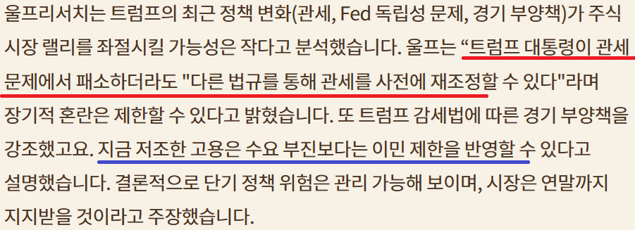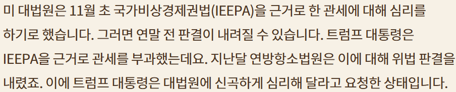 관세 관련 대법원(한국의 대법원+헌법재판소 개념) 심리 11월부터 결론은 내년으로 넘어갈 가능성; 트럼프 행정부 패소하더라도 다른 규제 법안으로 대체 가능; "메르의 블로그" 참조 링크; (무역확장법 232조 등 다른 tool로)