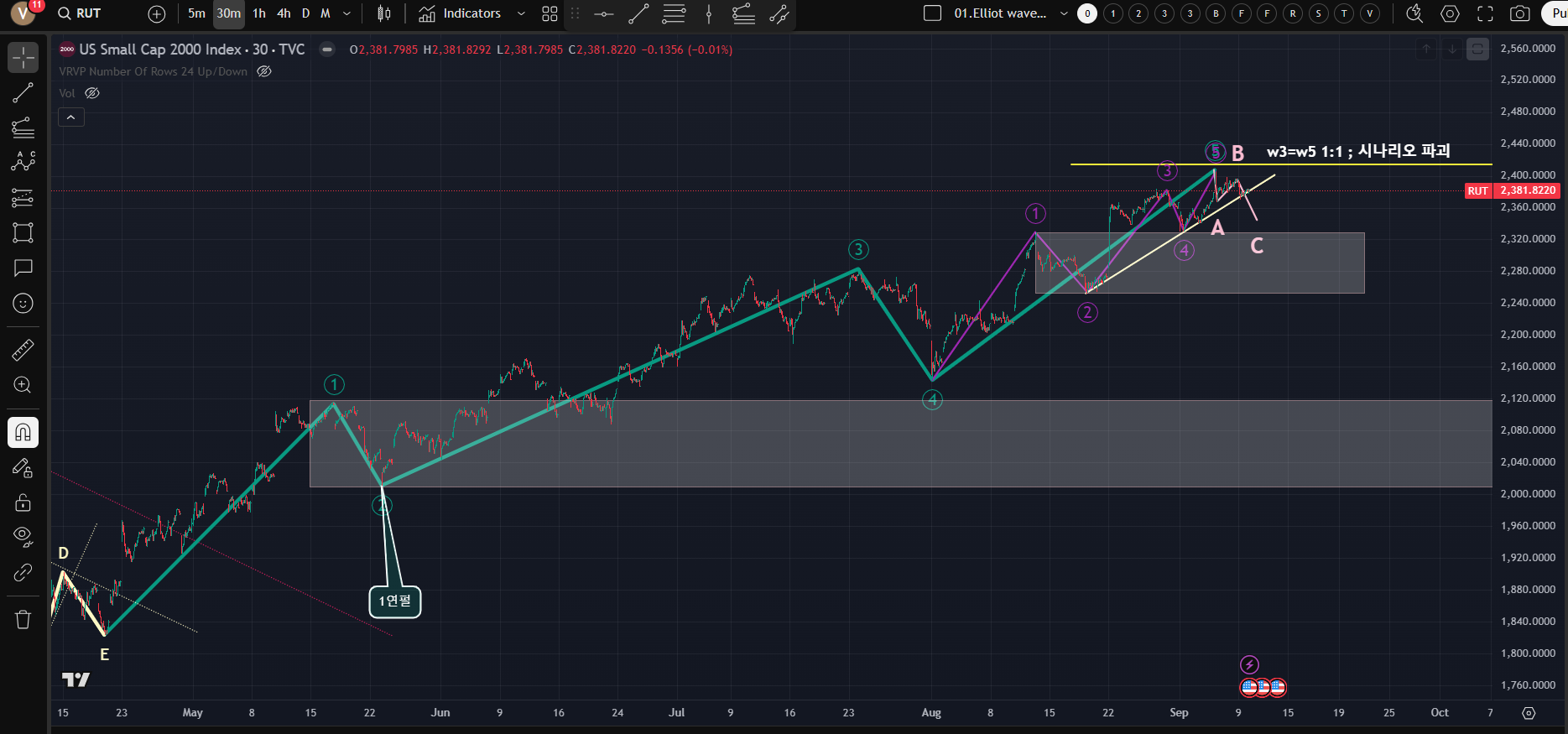 [큰 1파 연장 임펄스가 진행중으로 yellow line을 건드리면 파동 카운팅을 다시해야한다!; 큰 1파 연장 임펄스의 마지막 5파 내부의 purple line의 충격파의 2-4 추세선을 이탈했다고 판단하면 파동을 마무리했다고 가정할수 있다; 전체 큰 파동의 되돌림은 2파 가격 영역대까지 진행될 예정; light pink line의 플랫 조정파 출현 중]