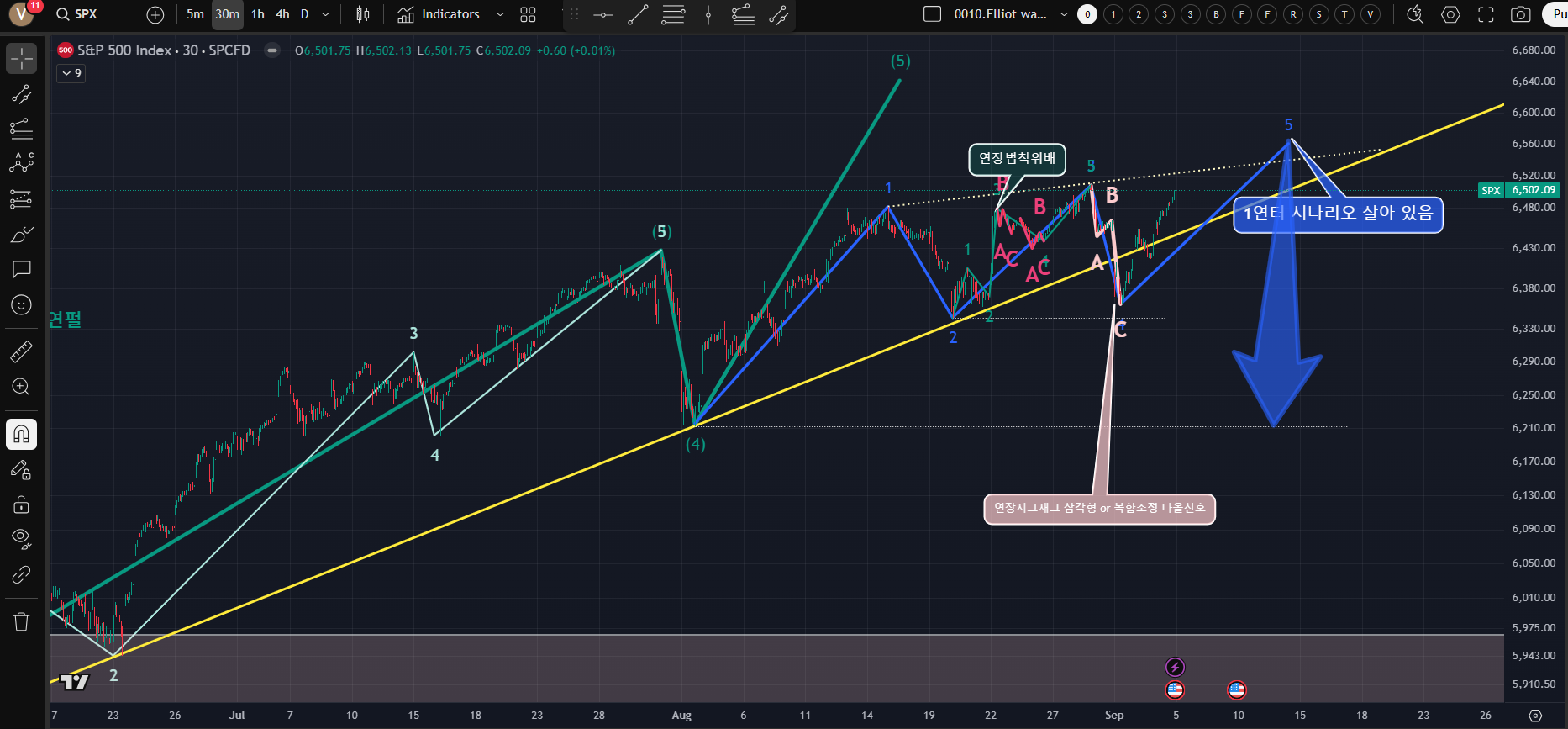 $SPX 파동은 이번주 상승으로 5-5파 다시 시나리오 설정 필요